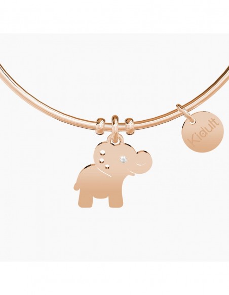 Forza, intelligenza e incredibile memoria, pu˜ sollevare monti e cambiare la storia. Chi lo indossa per sempre fortunato sarˆ e il desiderio di gloria forse si avvererˆ. Bangle in acciaio color oro rosa con ciondolo Elefante.