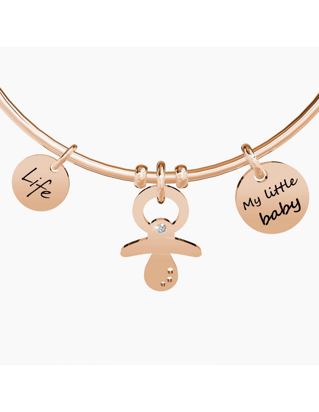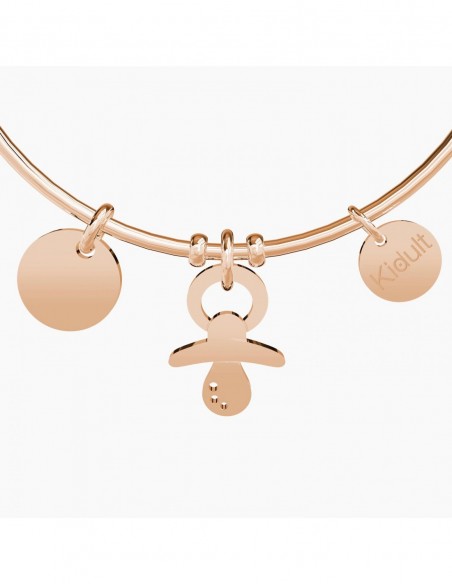 Bangle in acciaio color oro rosa con ciondoli Ciuccio e piastra tonda.