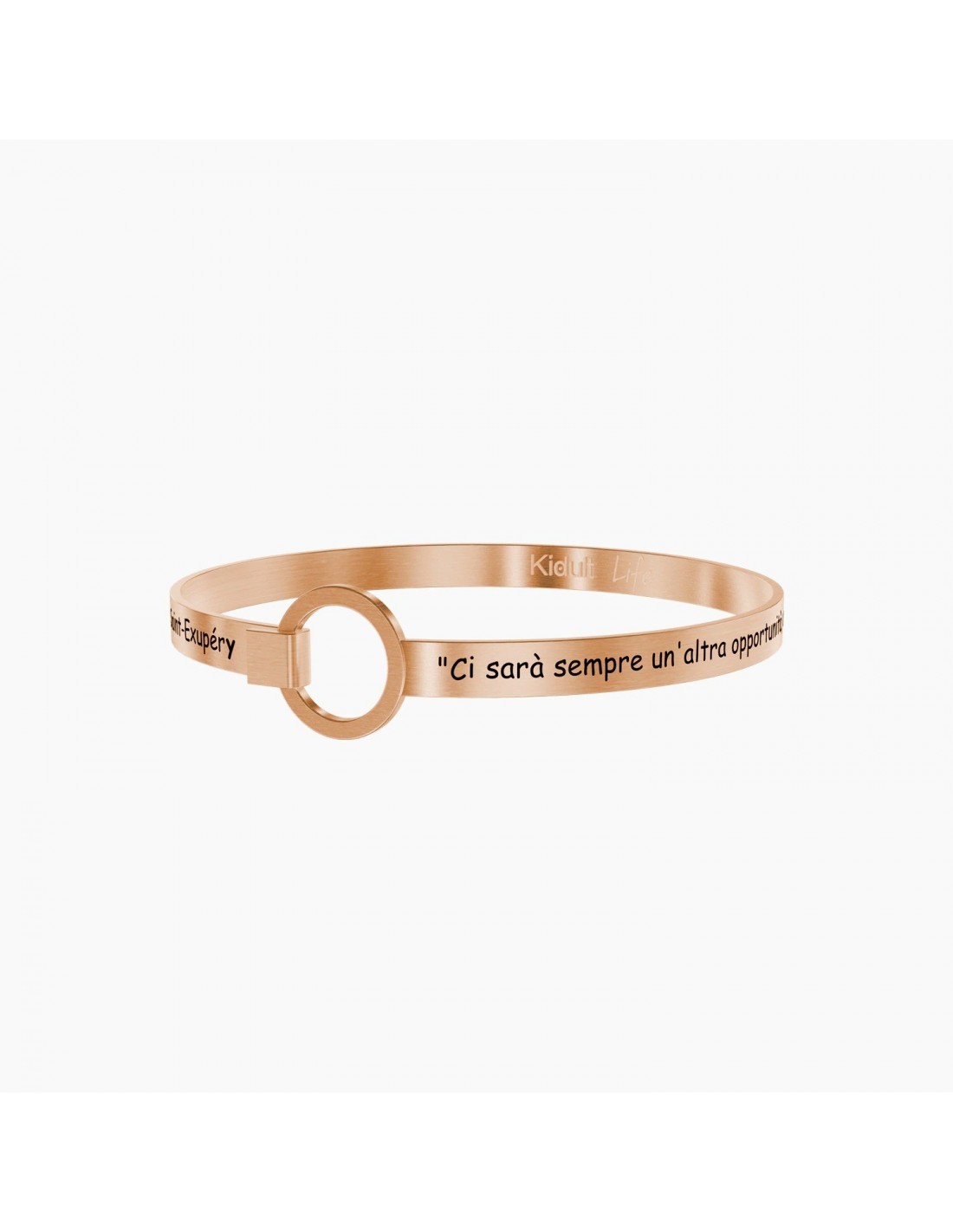 "Ci sarˆ sempre un'altra opportunitˆ, un'altra amicizia, un altro amore, una nuova forza. Per ogni fine c' un nuovo inizio". - Antoine de Saint-ExupŽry - Bangle in acciaio satinato color oro rosa.