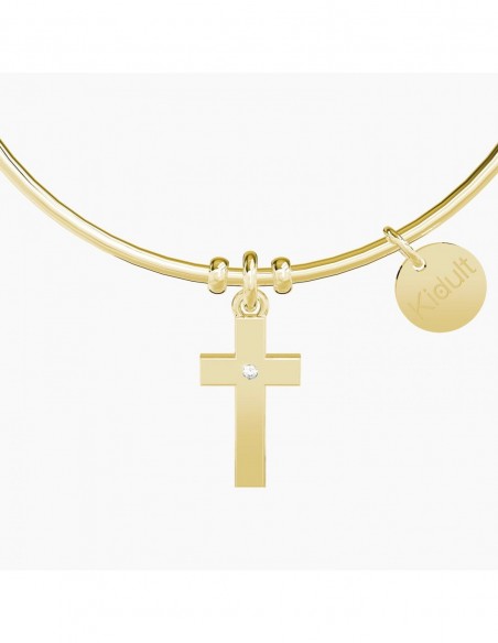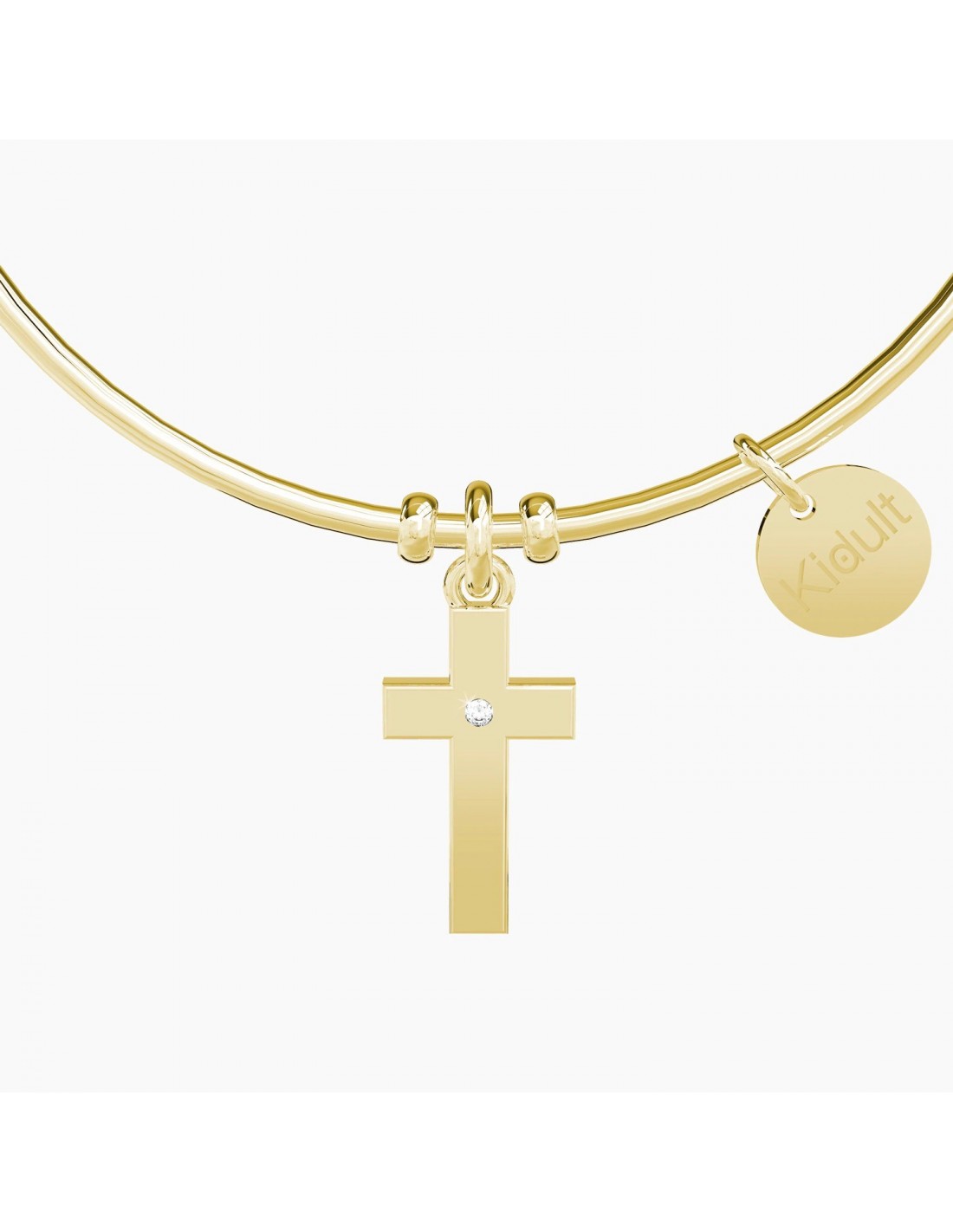 Ora hai la forza per credere in cio che sei e che sarai. La tua fede  cio che ti accompagna in ogni scelta che fai, che sorregge i tuoi passi e ti permette di raggiungere sempre la meta. Bangle in acciaio color oro giallo con ciondolo Croce.