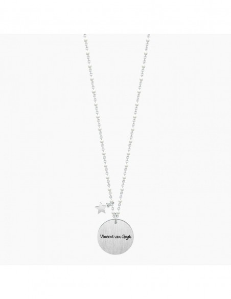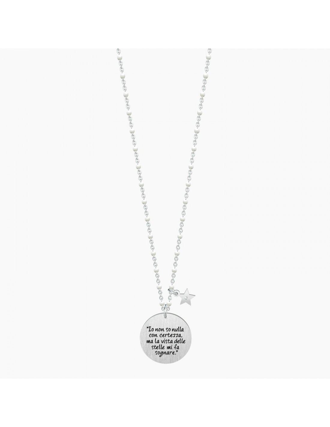 "Io non so nulla con certezza, ma la vista delle stelle mi fa sognare." - Vincent van Gogh - Collana lunga in acciaio con ciondolo satinato tondo e catena rol˜ con inserimenti in smalto bianco.