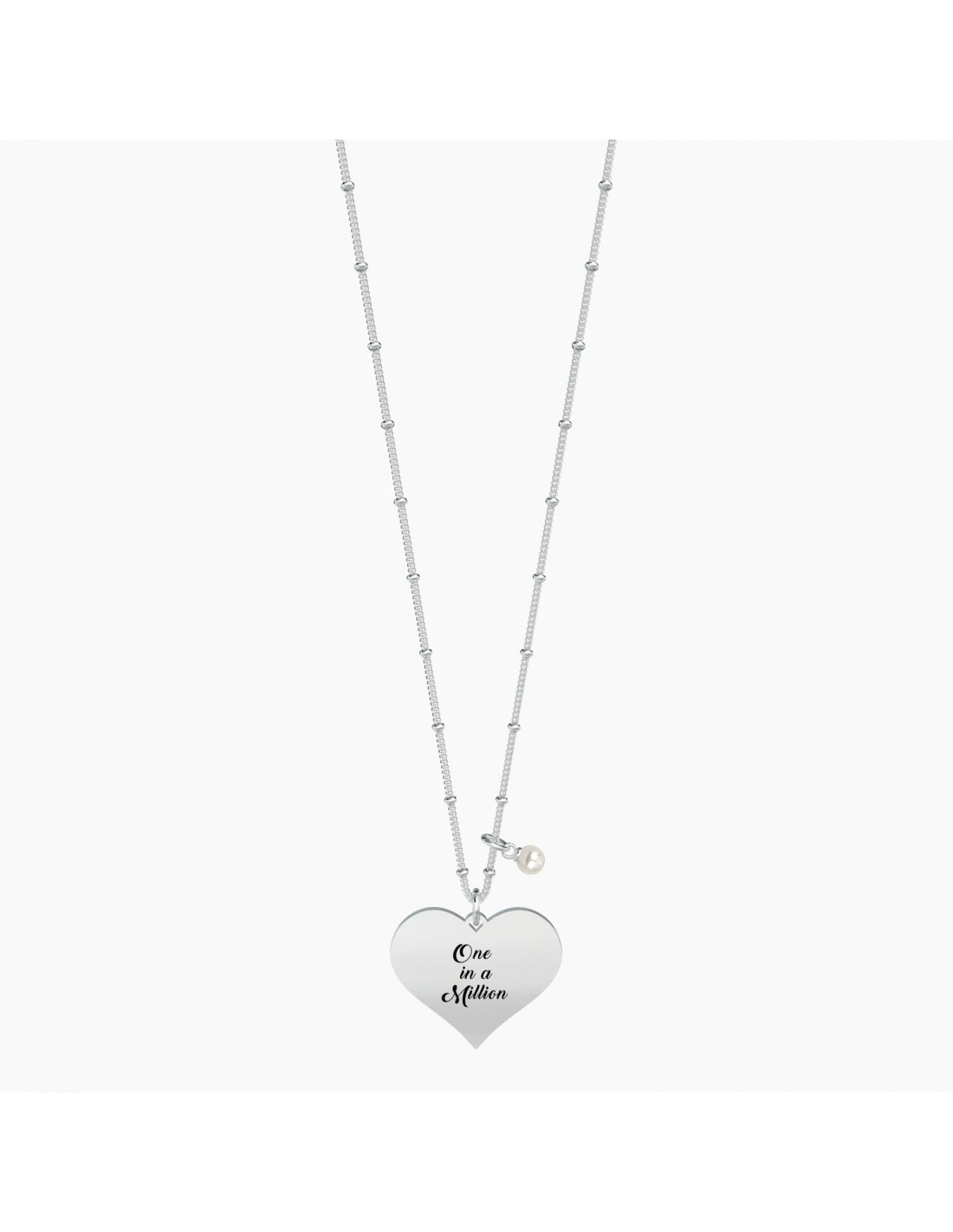 Tu cos“ diversa, inimitabile, unica. In questo universo, nessuno  come te. Sei una tra un milione, una vera perla rara. Collana lunga in acciaio con ciondolo a cuore, piccolo ciondolo con perla coltivata e catena groumette con anellini.