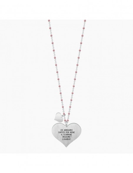 Collana lunga in acciaio con ciondolo satinato a cuore e catena rol con inserimenti in smalto rosa.