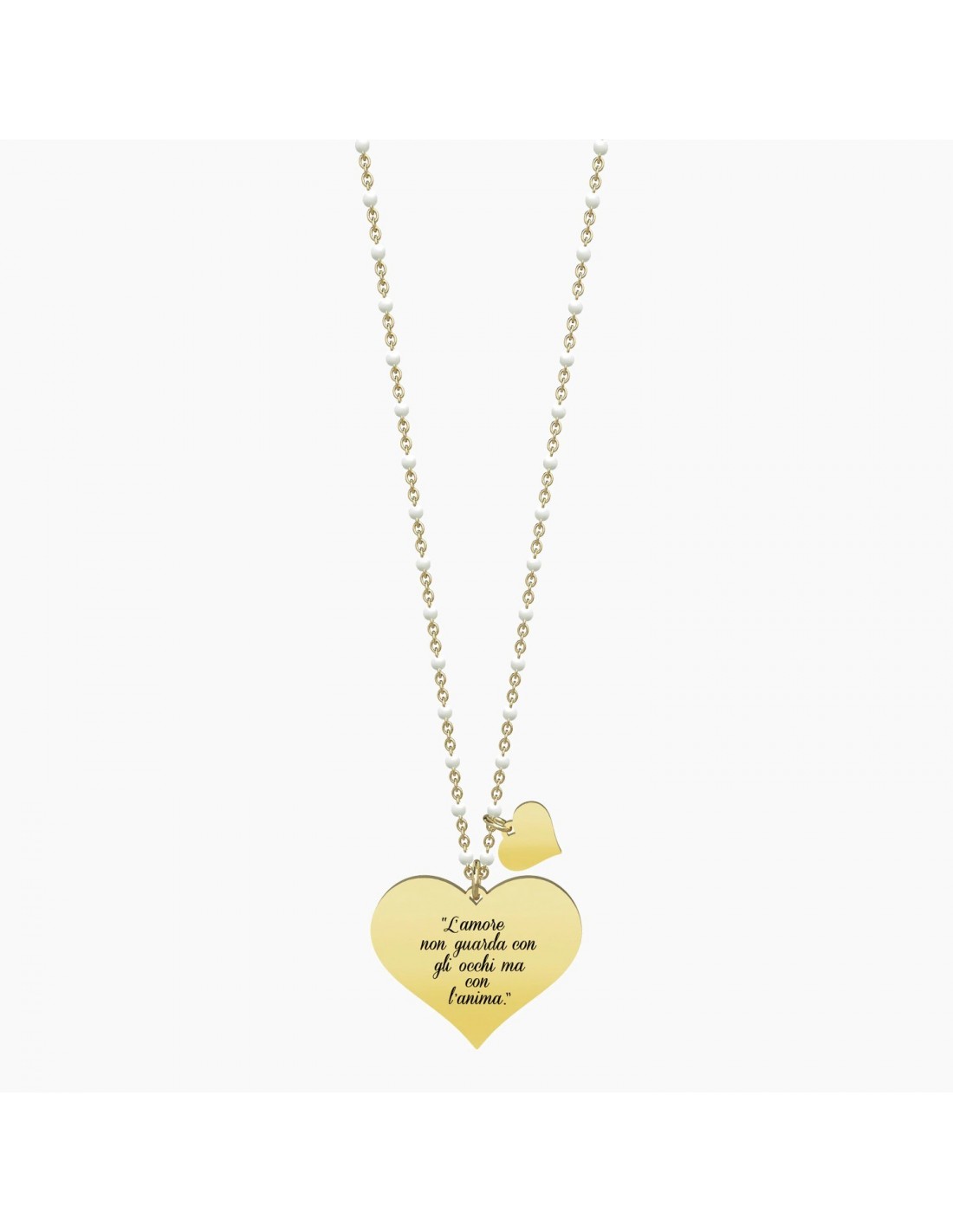 Collana lunga in acciaio color oro con ciondolo a cuore e catena rol con inserimenti in smalto bianco.