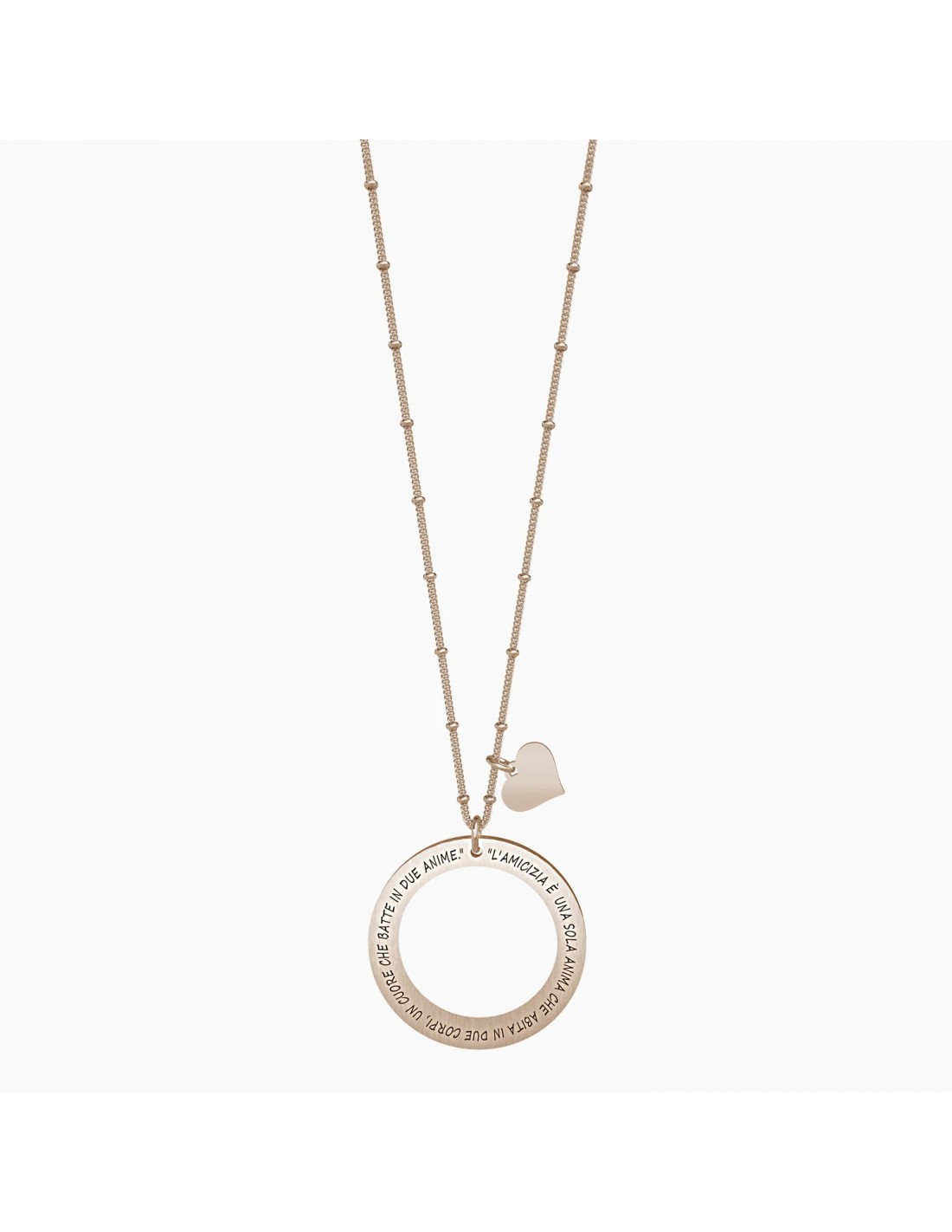 "L'amicizia  una sola anima che abita in due corpi, un cuore che batte in due anime." - Aristotele - Collana lunga in acciaio color oro rosa con ciondolo satinato a cerchio e catena groumette con anellini.