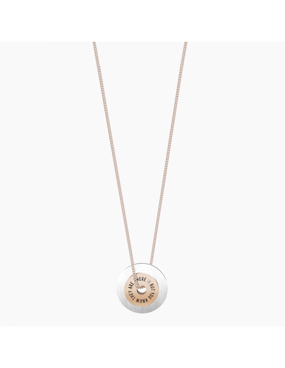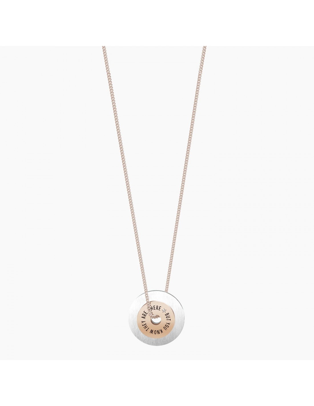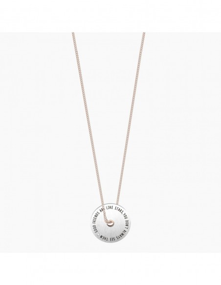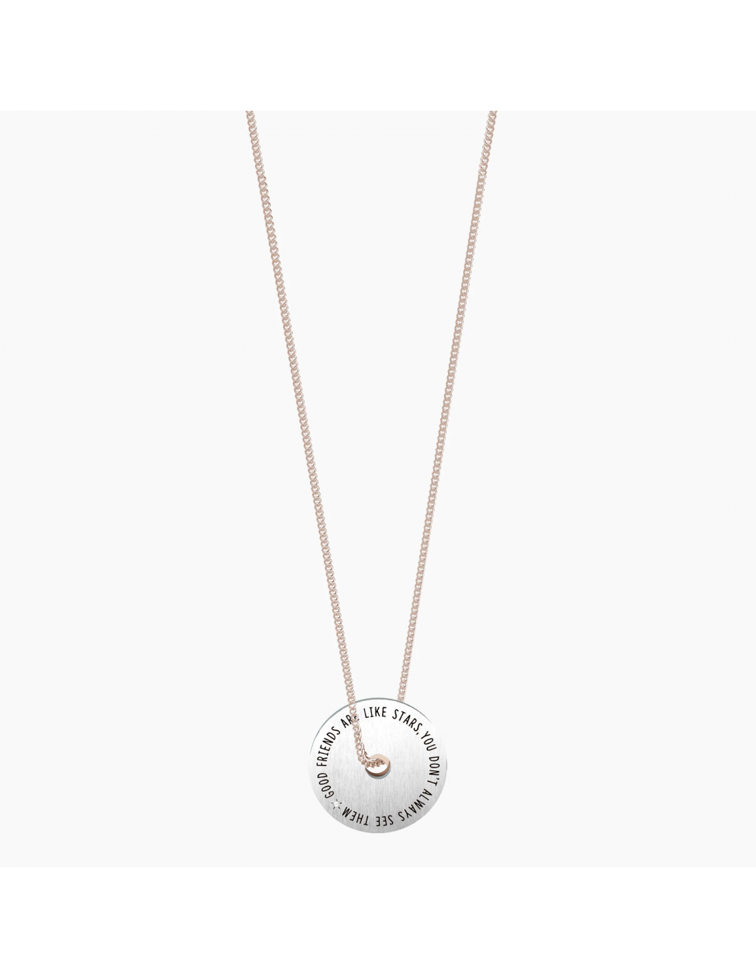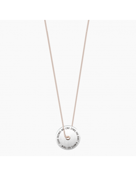 Good friends are like stars, you don't always see them but you know they are there Collana lunga in acciaio color oro rosa con ciondolo satinato a doppia ruota e catena groumette.