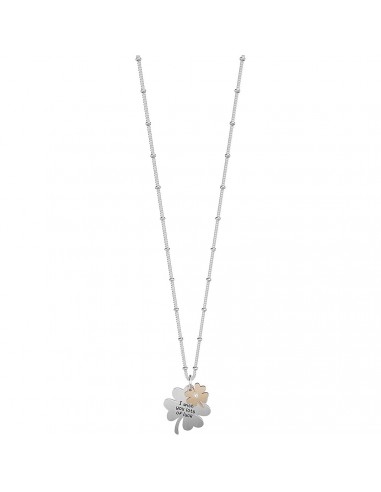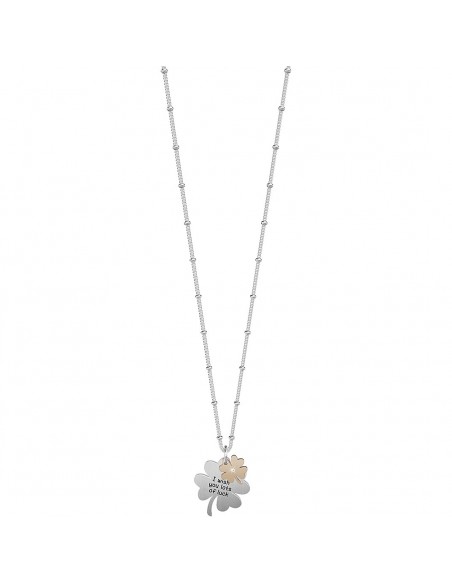Il prato nasconde un verde talismano, se la fortuna ti vede ti prende per mano. Ricchezza, amore e amicizia sincera, con quattro foglie il tuo sogno si avvera! Collana di media lunghezza in acciaio con ciondolo satinato a forma di quadrifoglio, ciondolo rosŽ a forma di quadrifoglio e catena groumette con anellini.
