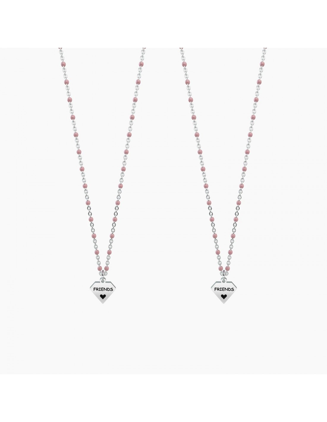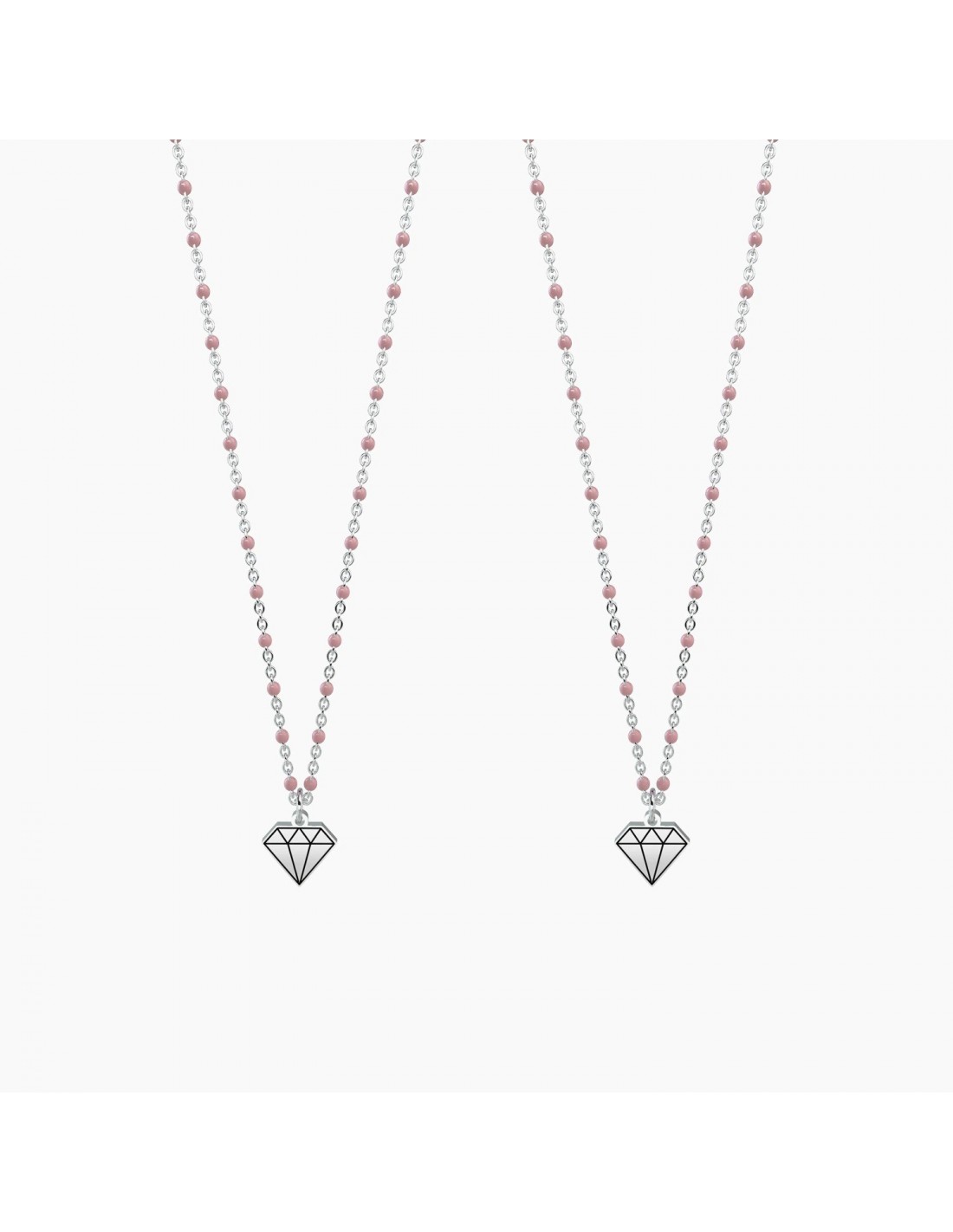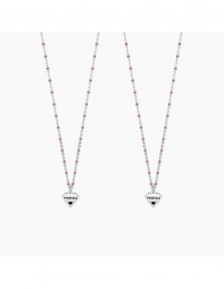 Ci siamo trovate per caso, ma da quel giorno non ci siamo pi lasciate. Non rinuncerei alla nostra amicizia per tutto l'oro del mondo, perchŽ non c' tesoro pi prezioso. Set di due collane corte in acciaio con ciondolo diamante e catena rol˜ con inserimenti in smalto rosa.