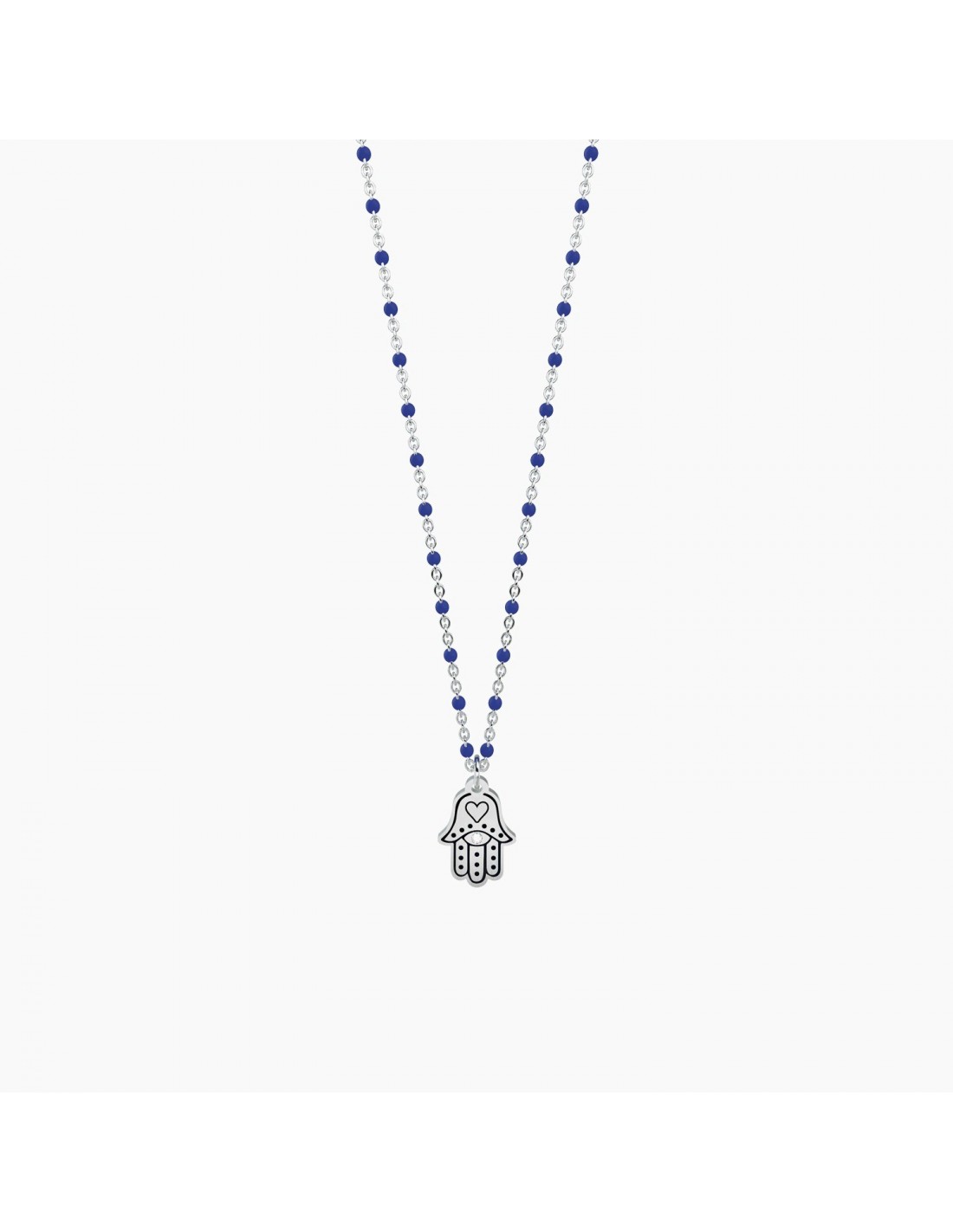 Collana corta in acciaio con ciondolo mano di fatima e catena rol con inserimenti in smalto blu.