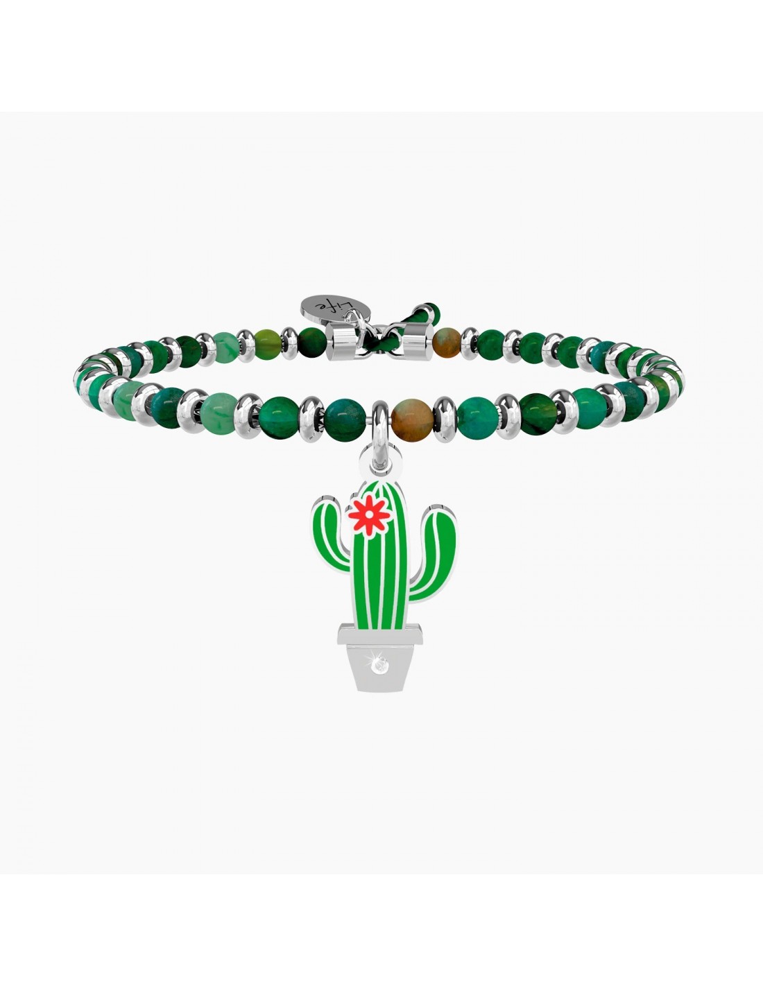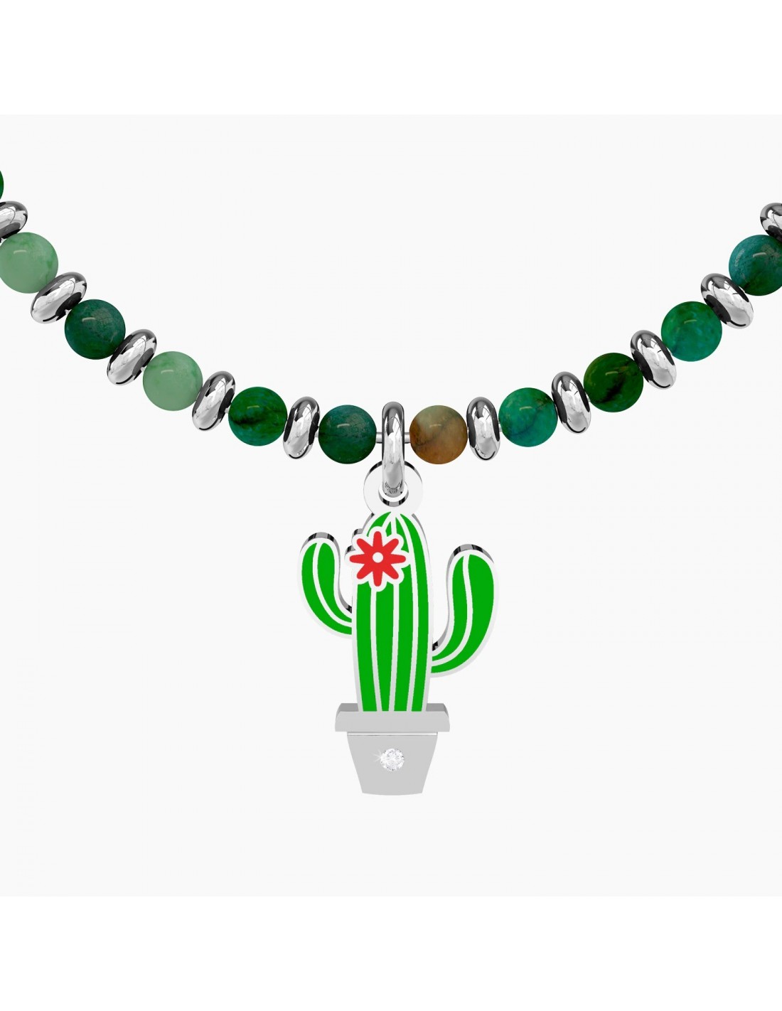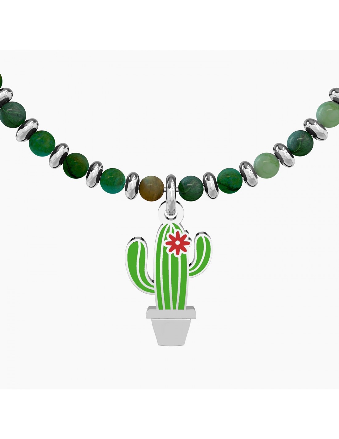 Sempre pronta ad accogliere chi ti si avvicina in un sincero abbraccio. Solo chi andrˆ oltre le apparenze potrˆ scoprire di cosa sei capace. Bangle con filo armonico in acciaio, sfere in agata verde e ciondolo a forma di cactus smaltato.