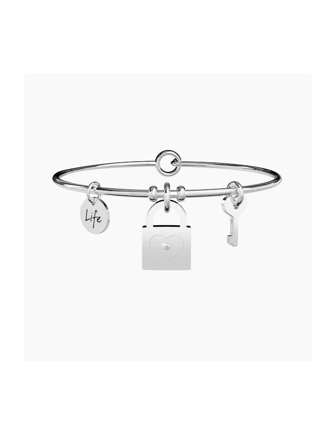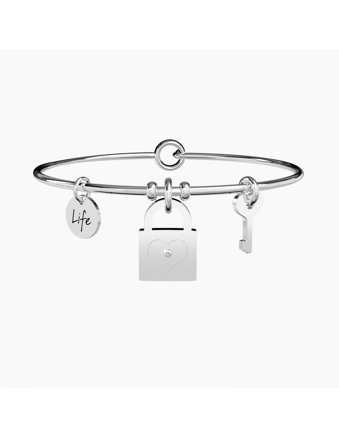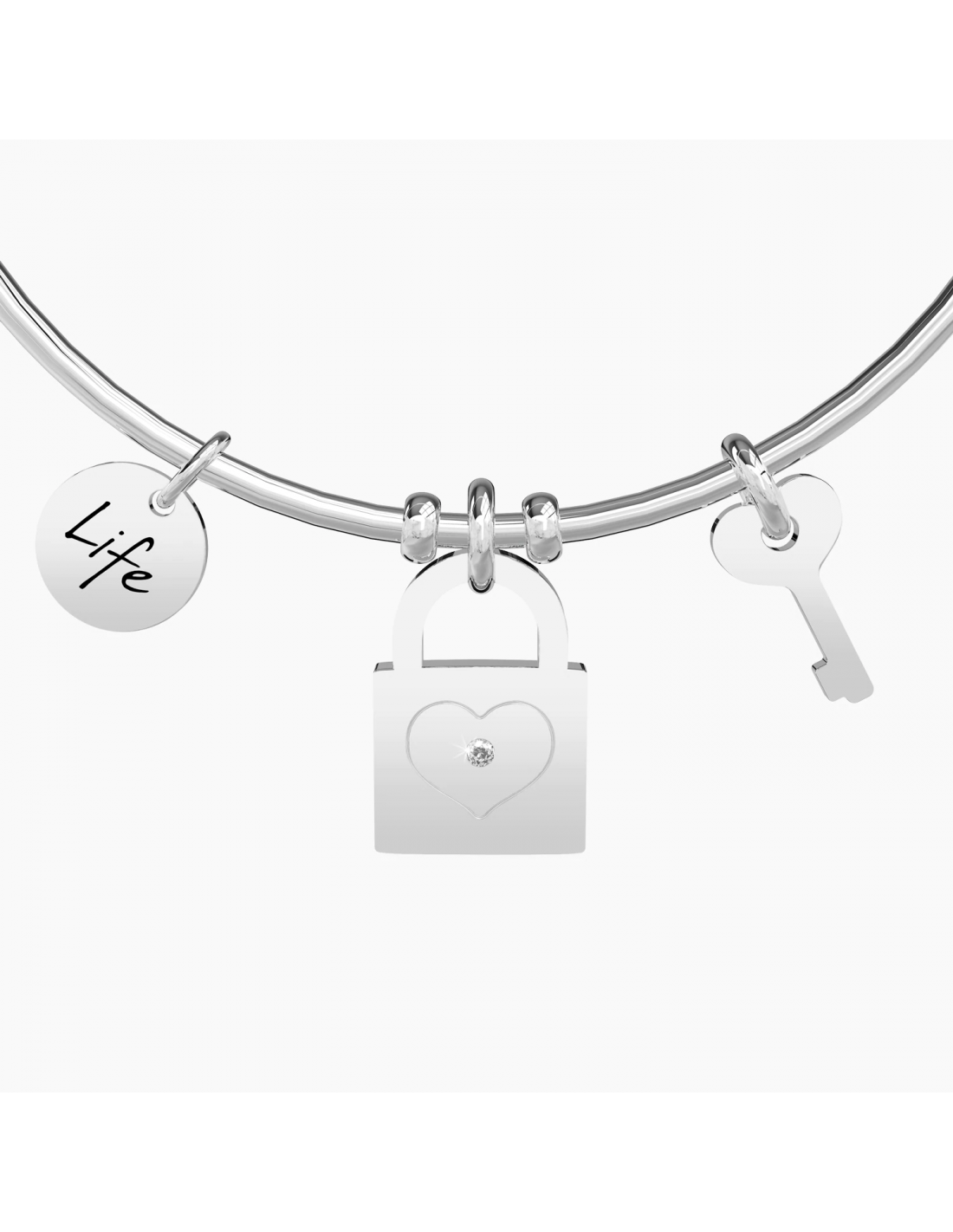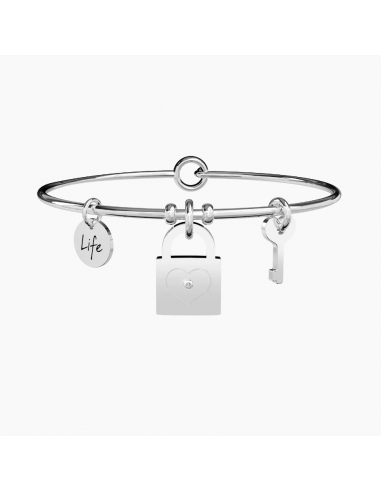 La nostra amicizia  forte, un legame che resisterˆ a tutto. Abbiamo gettato la chiave in mare e i nostri segreti sono al sicuro. Ora siamo davvero inseparabili. Bangle in acciaio con ciondoli a forma di lucchetto e a forma di chiave.
