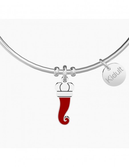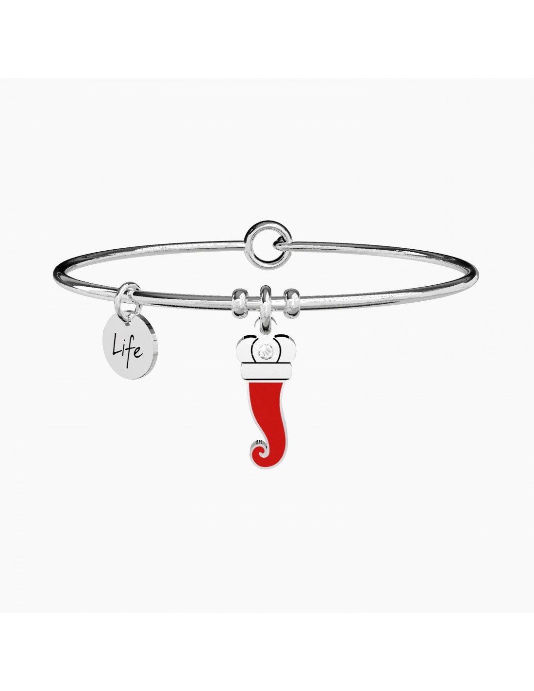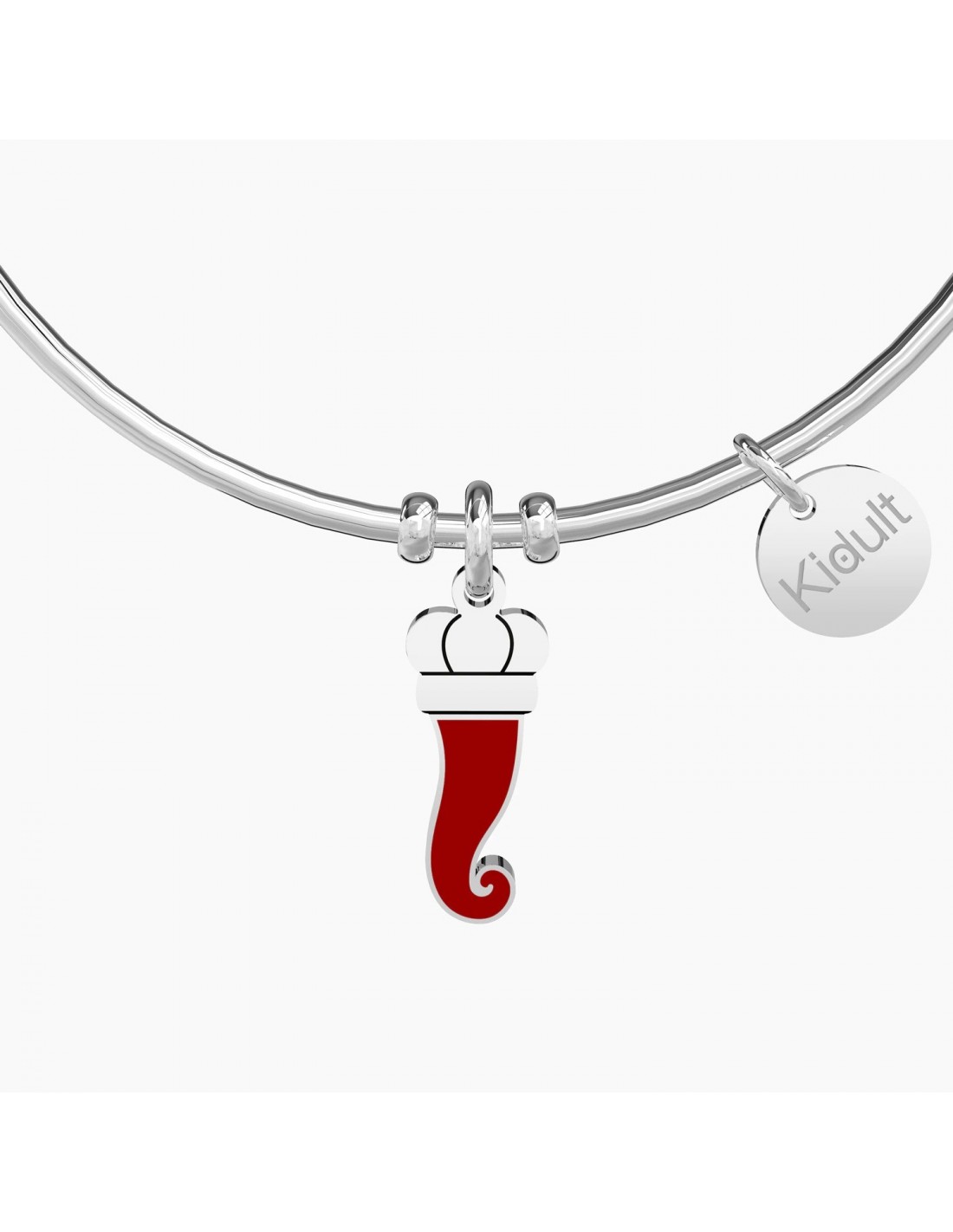 é l'arma per vincere ogni tua sfida, ti protegge dai guai che riserva la vita. Allontana l'invidia del male qui intorno, toccalo sempre, ogni mese, ogni giorno. Bangle in acciaio con ciondolo a forma di cornetto smaltato rosso.