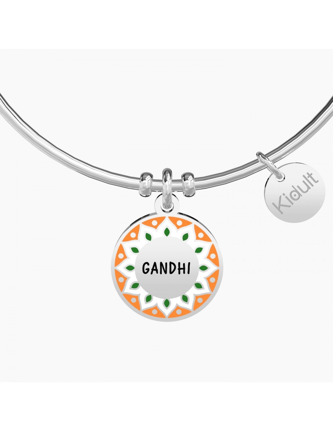 Bangle in acciaio con ciondolo tondo con disegno simil mandala sul retro.
