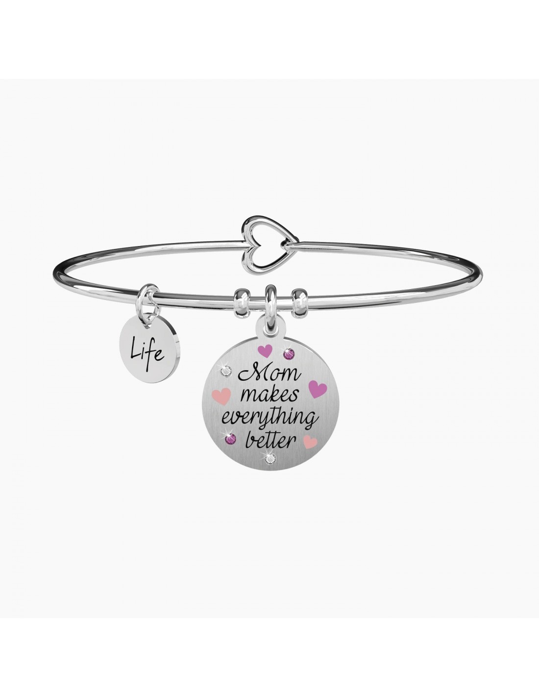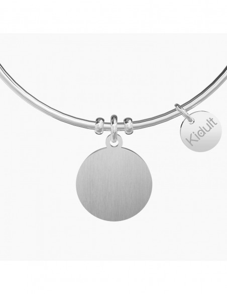 Bangle in acciaio con ciondolo tondo satinato con cristalli colorati e applicazioni smaltate.