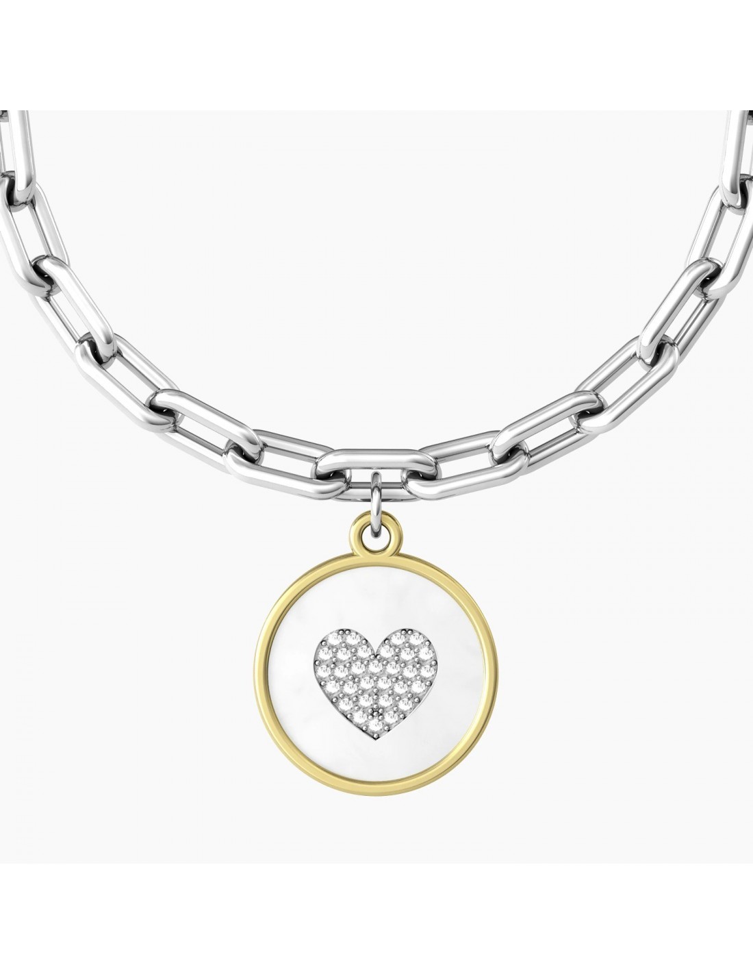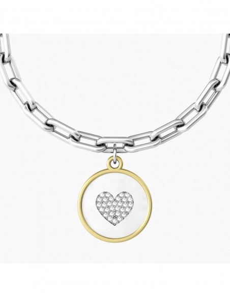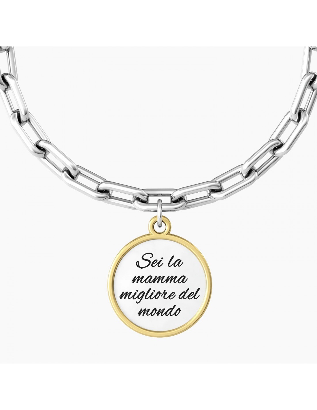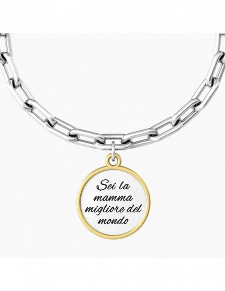 Mi aiuti, mi consigli, mi incoraggi, mi consoli, mi capisci, mi ami. Sei la mamma migliore del mondo. Bracciale in acciaio con catena a maglie ovali "comfort fit" e ciondolo satinato tondo con rifinitura color oro giallo e cuore in cristalli.