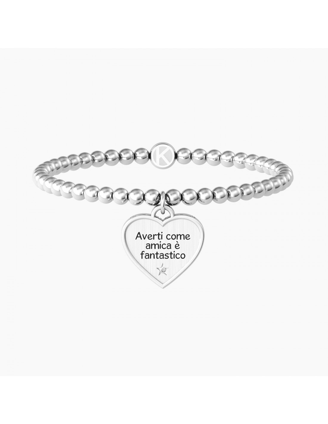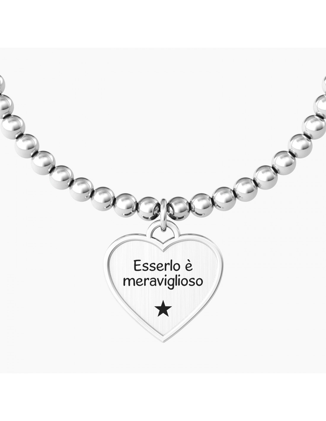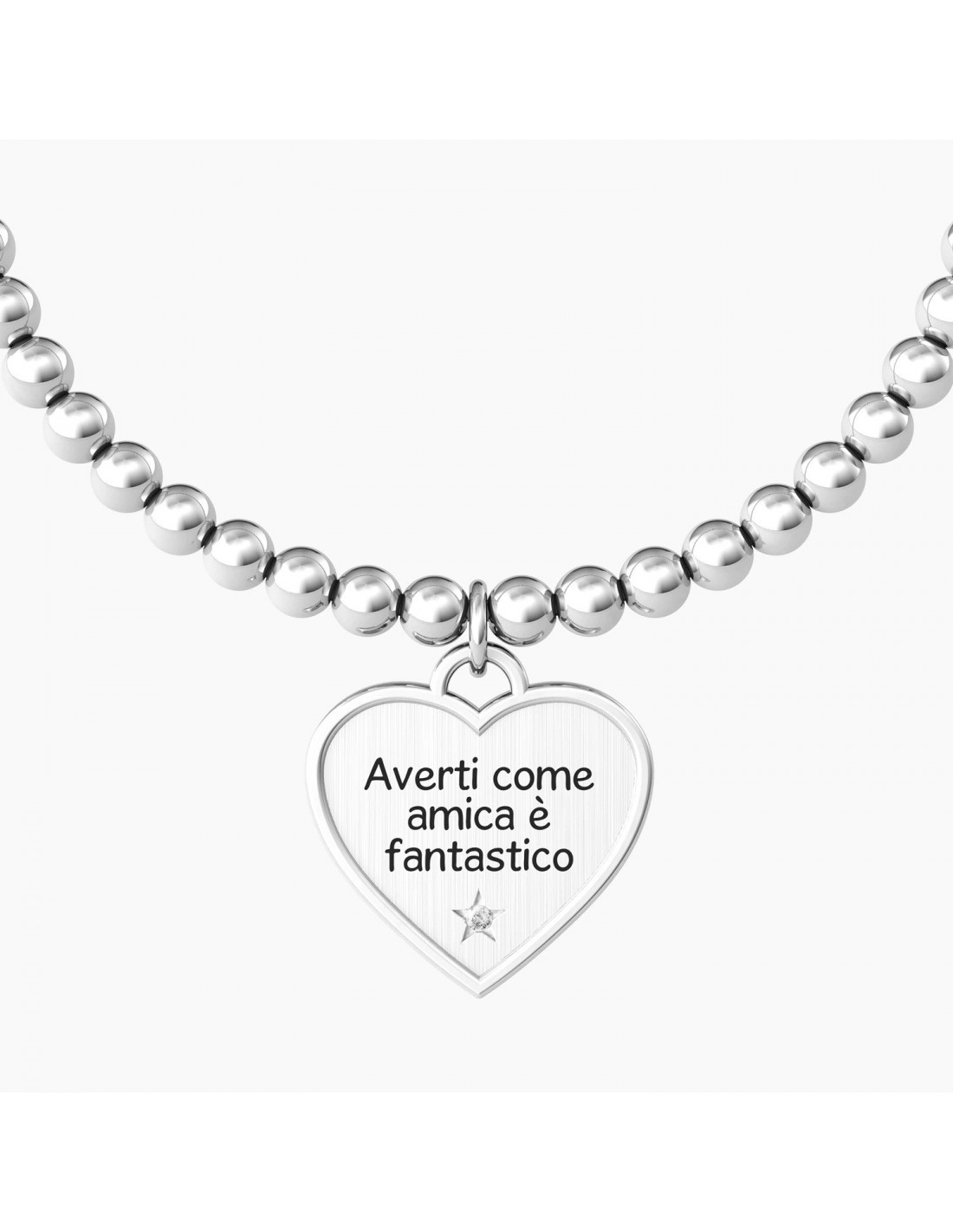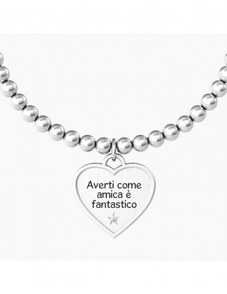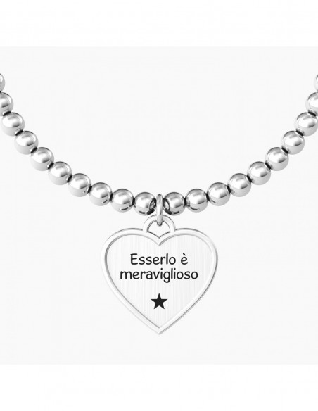 Bracciale elastico con sfere in acciaio e ciondolo satinato a cuore con cristallo.