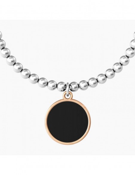 Fianco a fianco, passo dopo passo, giorno dopo giorno. Io e te, sorelle per sempre. Bracciale elastico con sfere in acciaio e ciondolo satinato nero tondo con rifinitura color oro rosa e cristallo.