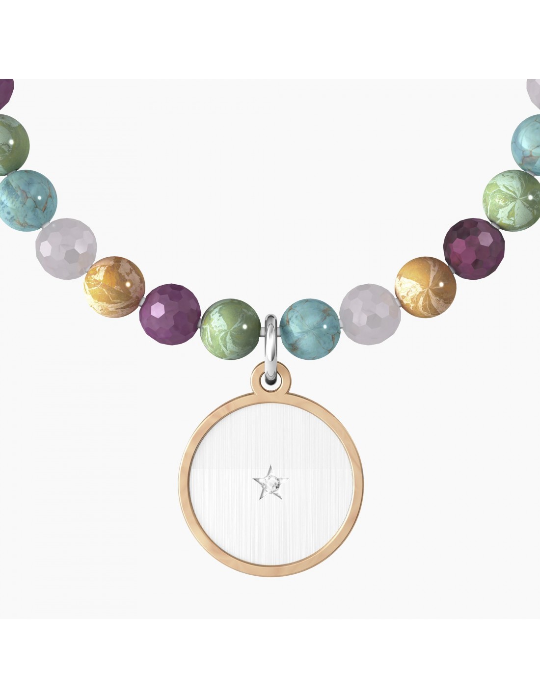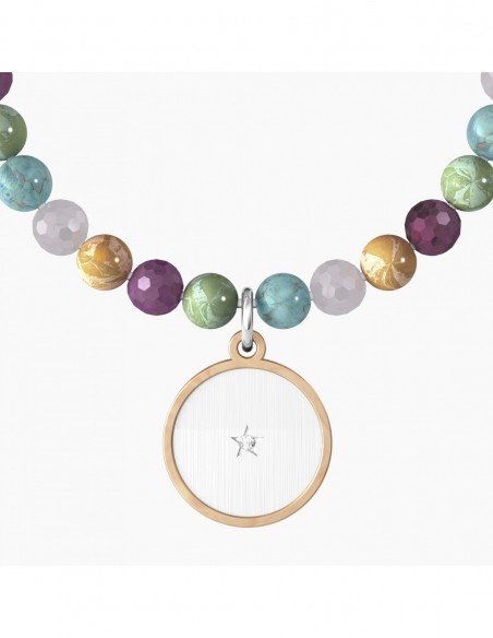 Bracciale elastico con sfere in pietre multicolor e ciondolo satinato tondo con rifinitura borchiata color oro rosa.