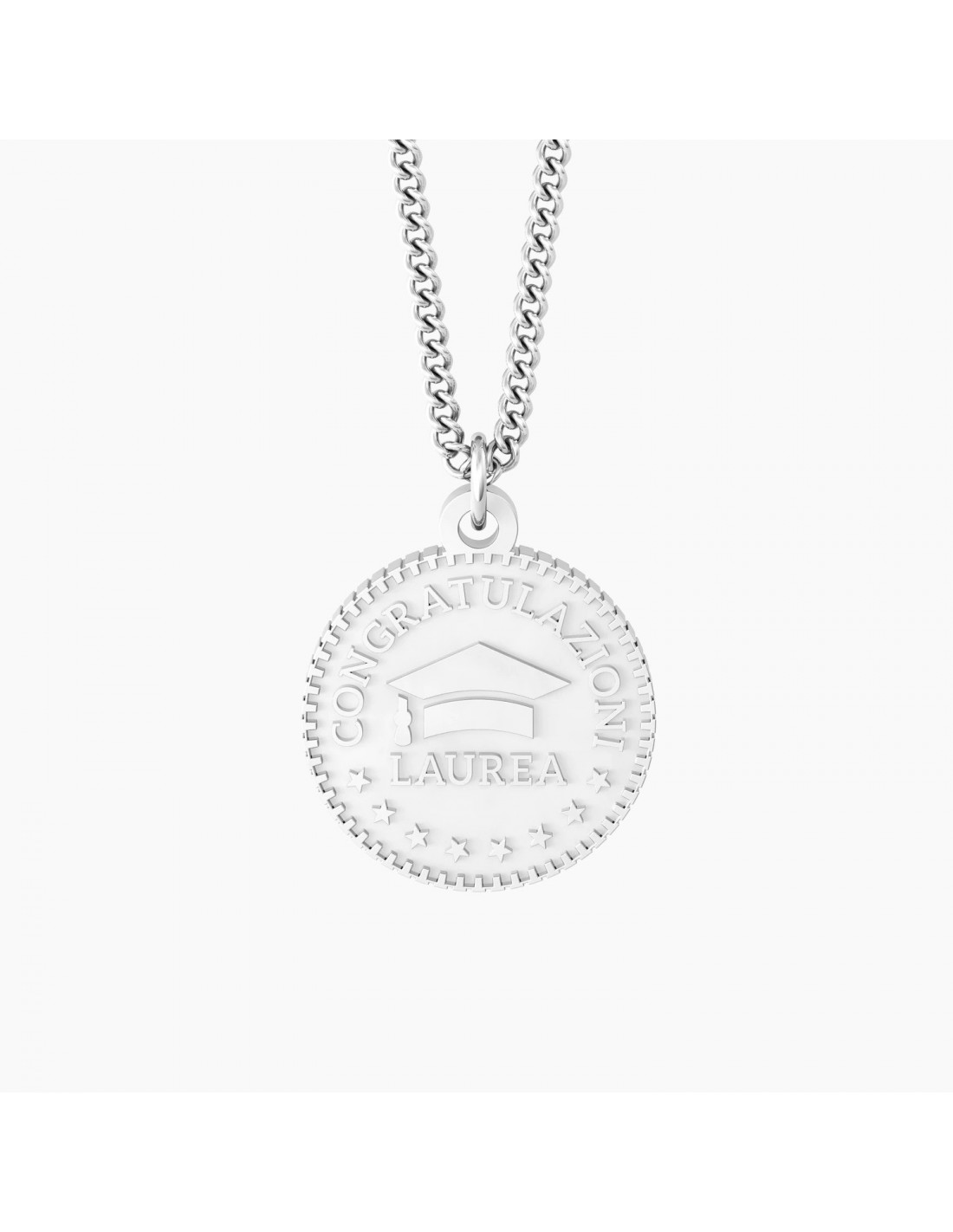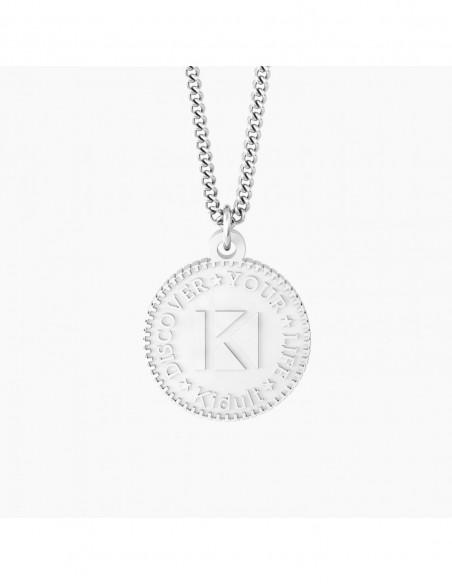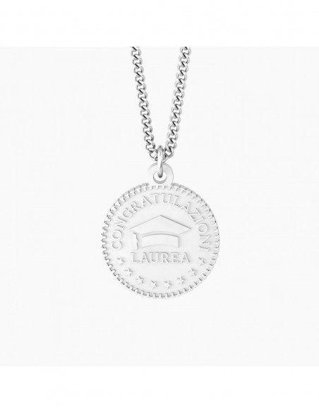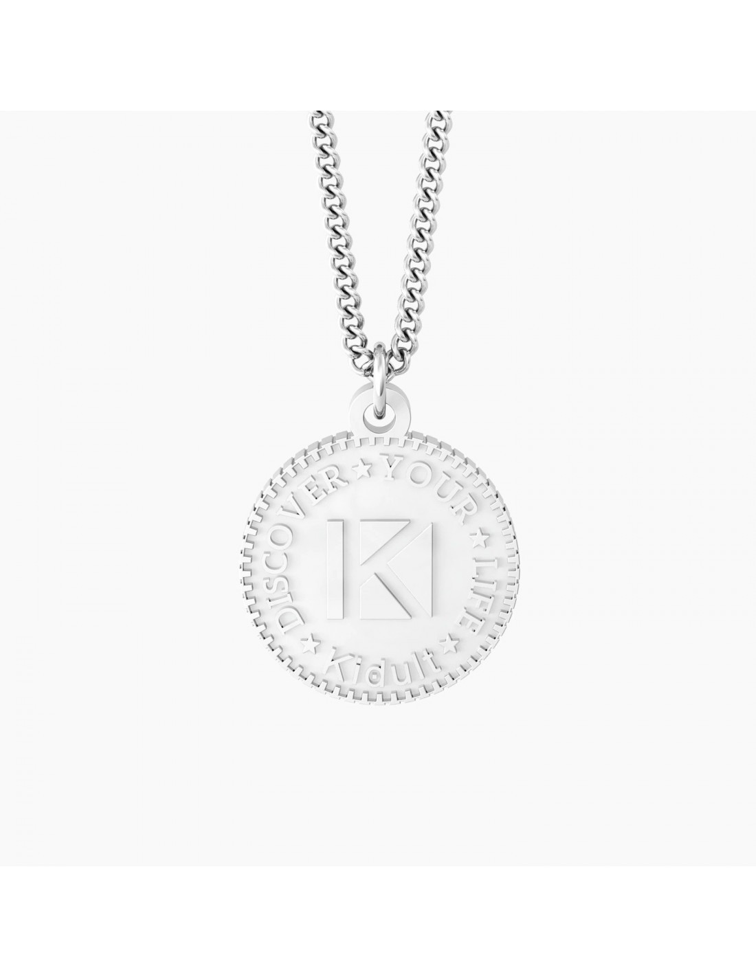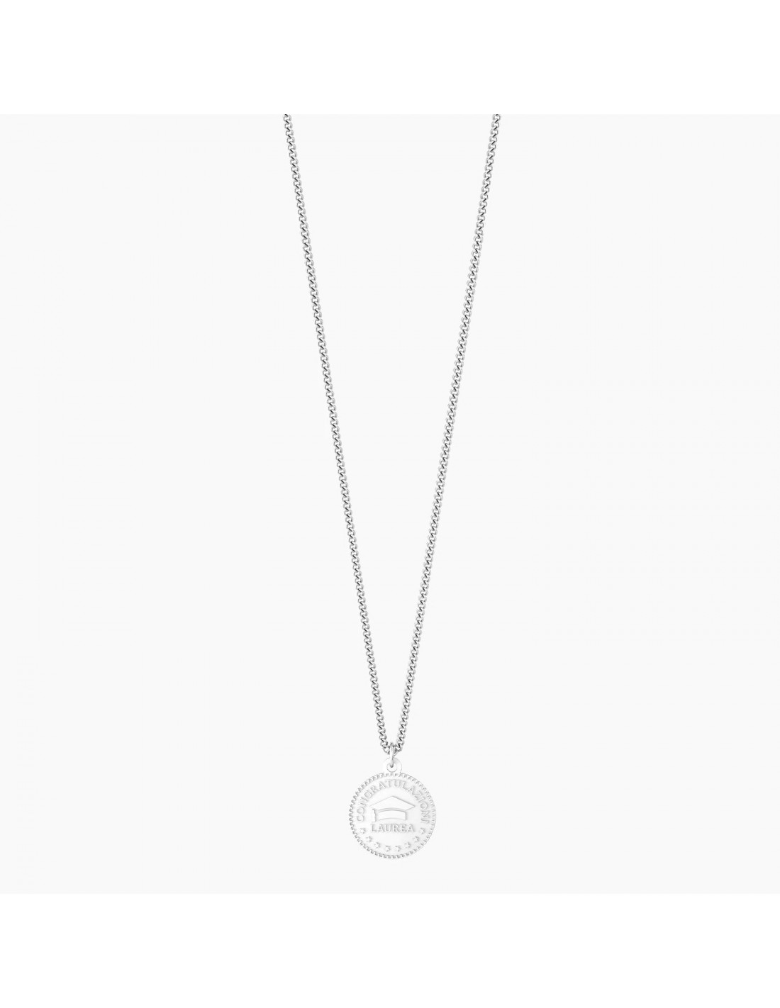 Collana lunga in acciaio con ciondolo lucido a forma di moneta e catena groumette.