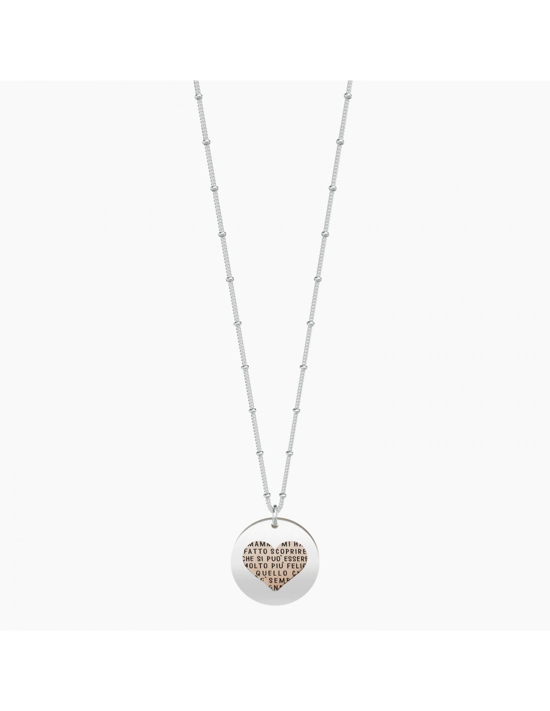 Collana lunga in acciaio con ciondolo doppio satinato a cuore color oro rosa e catena groumette con anellini.