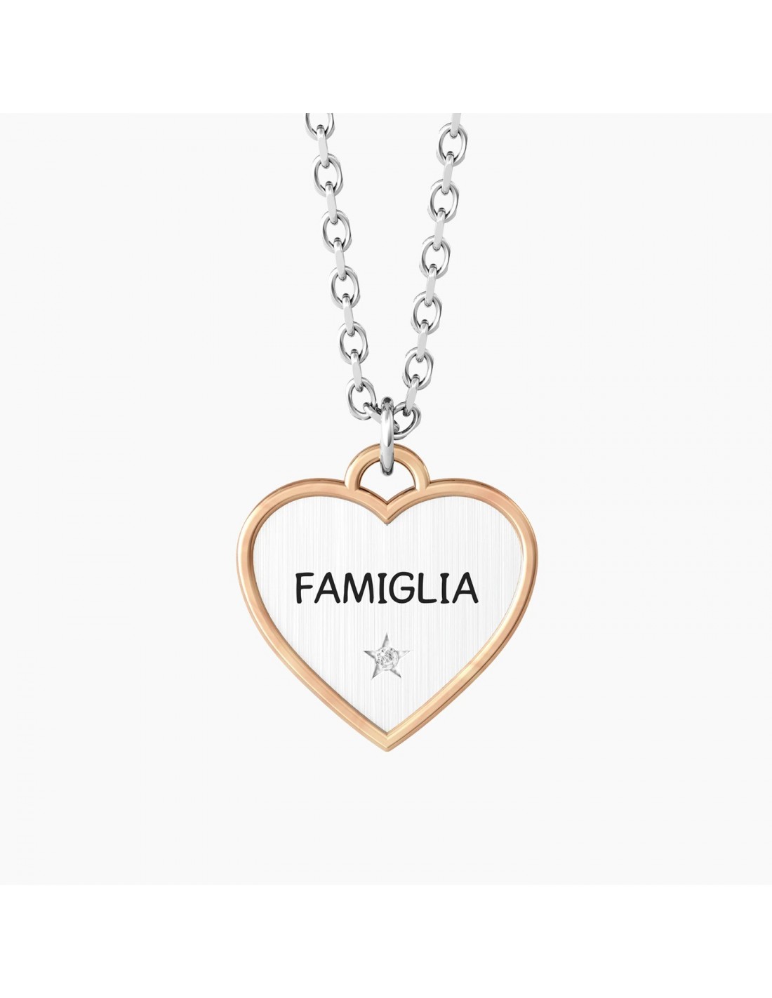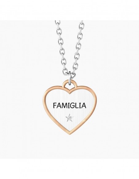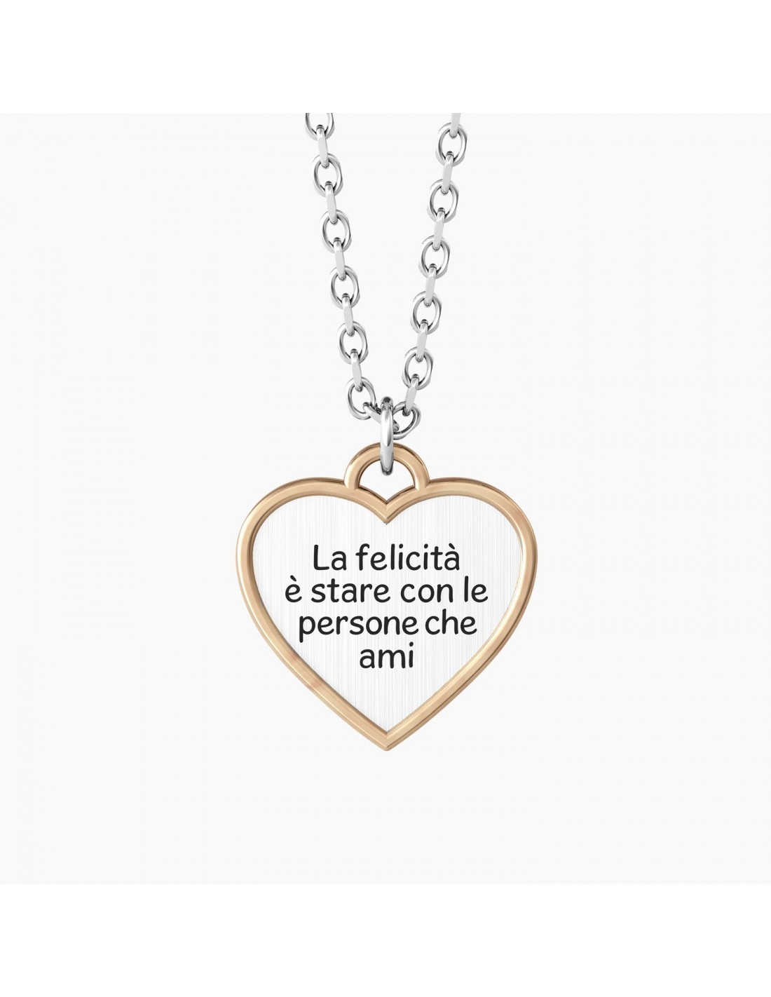 La felicit stare con le persone che ami Collana lunga in acciaio con ciondolo satinato a cuore con rifinitura color oro giallo e cristallo e catena rol.