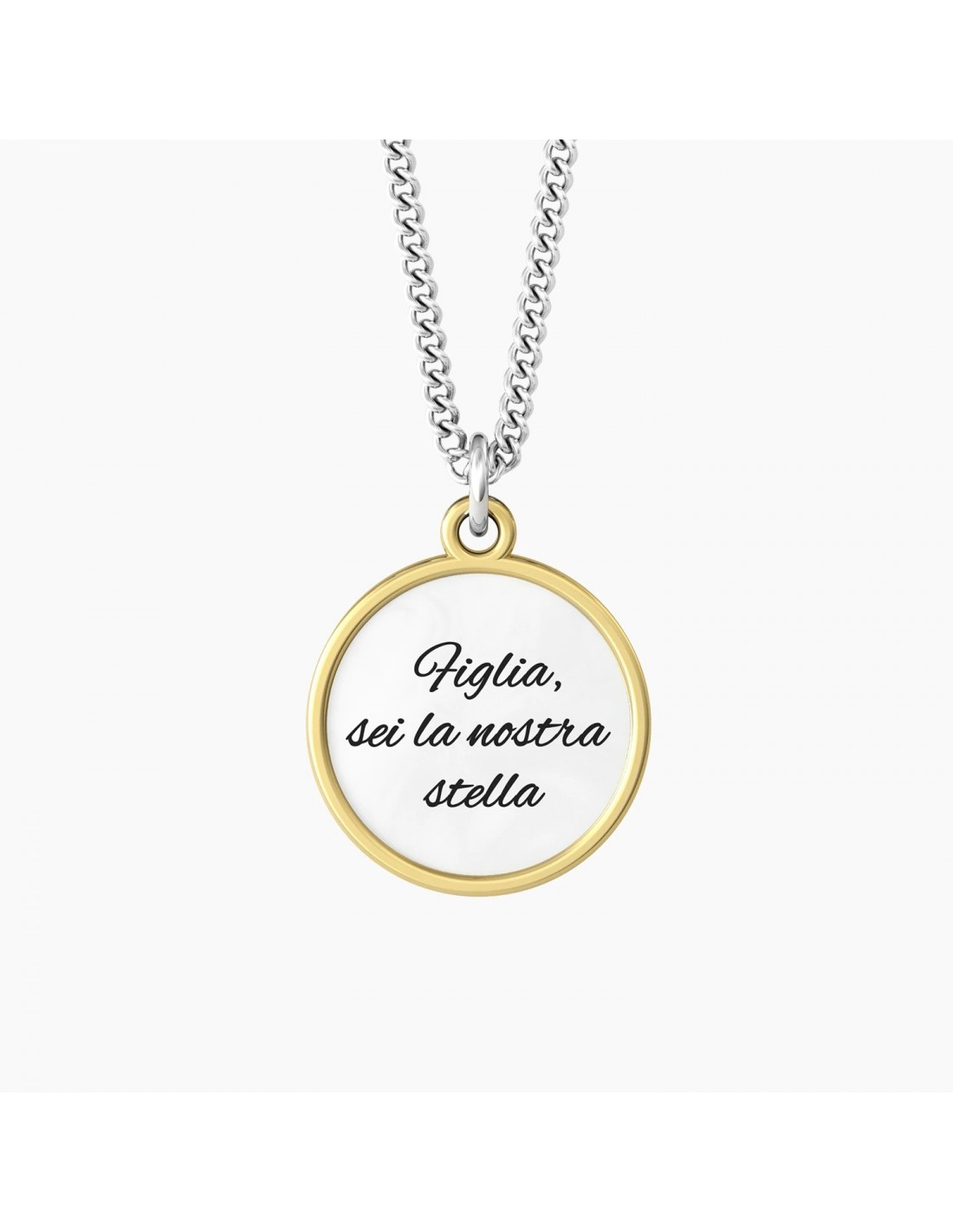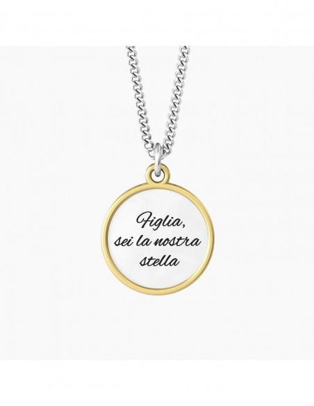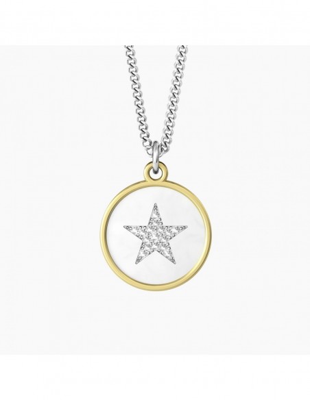 Collana corta in acciaio con ciondolo satinato tondo con rifinitura color oro giallo e stella in cristalli e catena groumette.