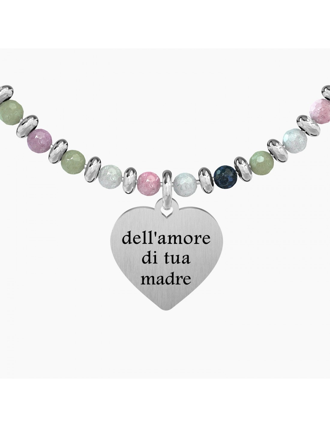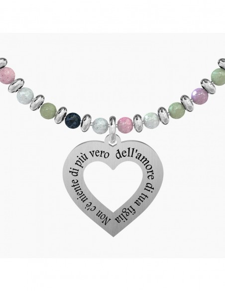 Set di due bangle con filo armonico in acciaio, sfere in agata multicolor e ciondolo satinato a cuore.