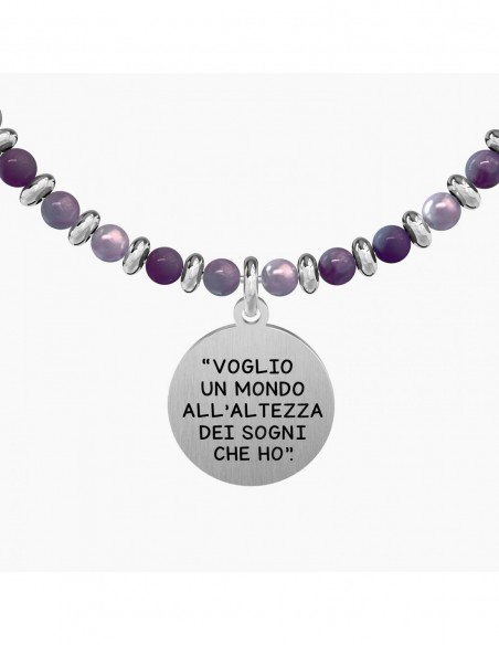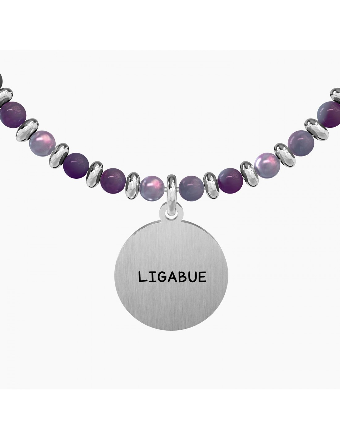 Ligabue Official Collection "Voglio un mondo all'altezza dei sogni che ho". Ligabue Bangle con filo armonico in acciaio, sfere in ametista e ciondolo satinato tondo.