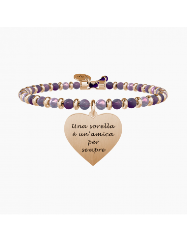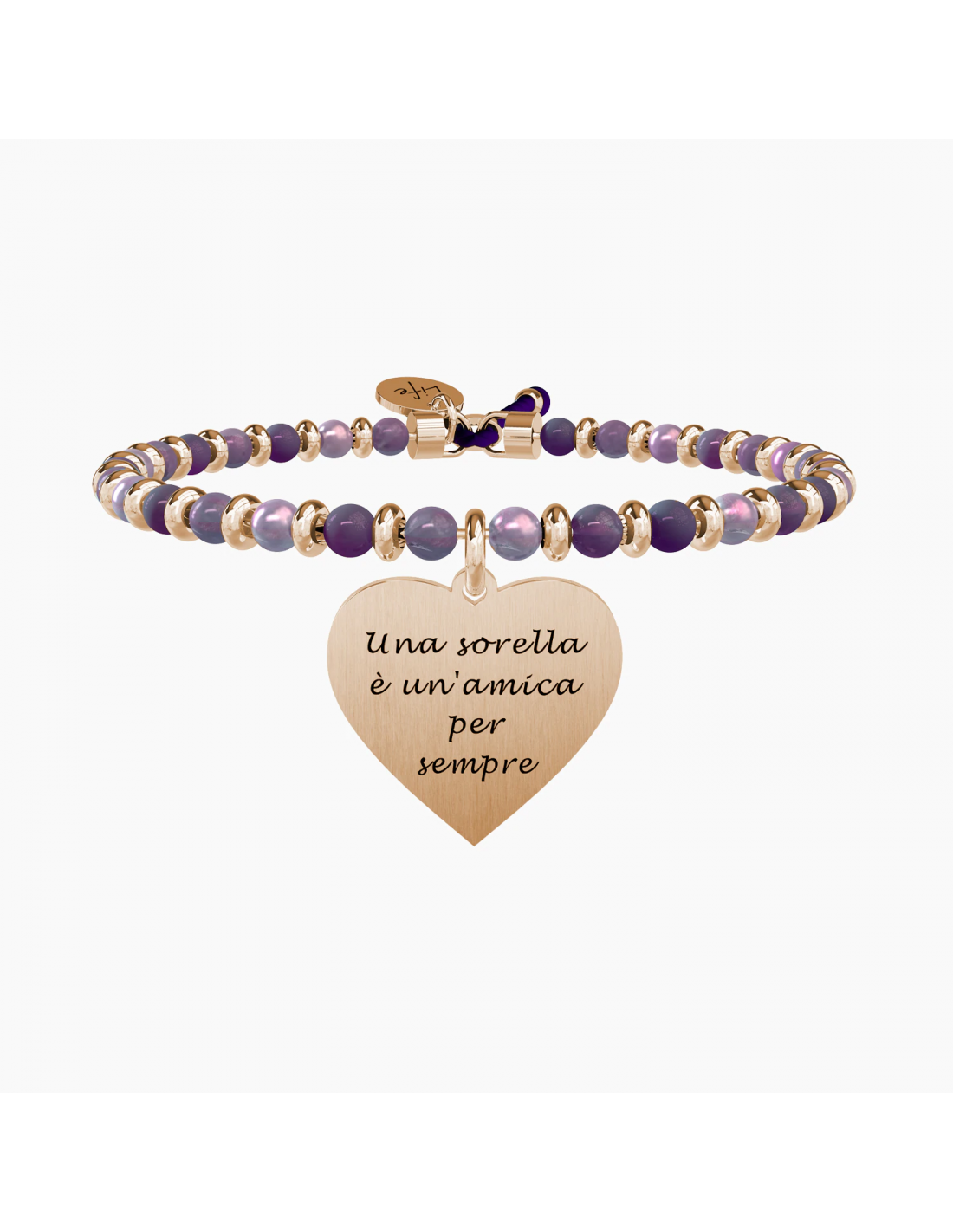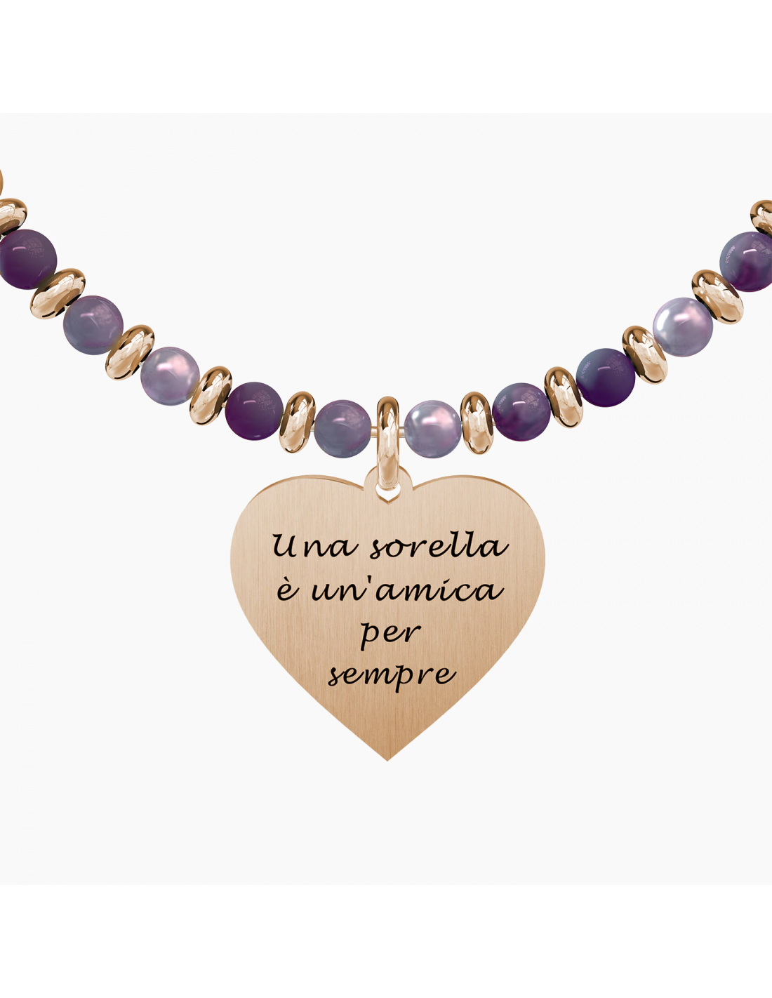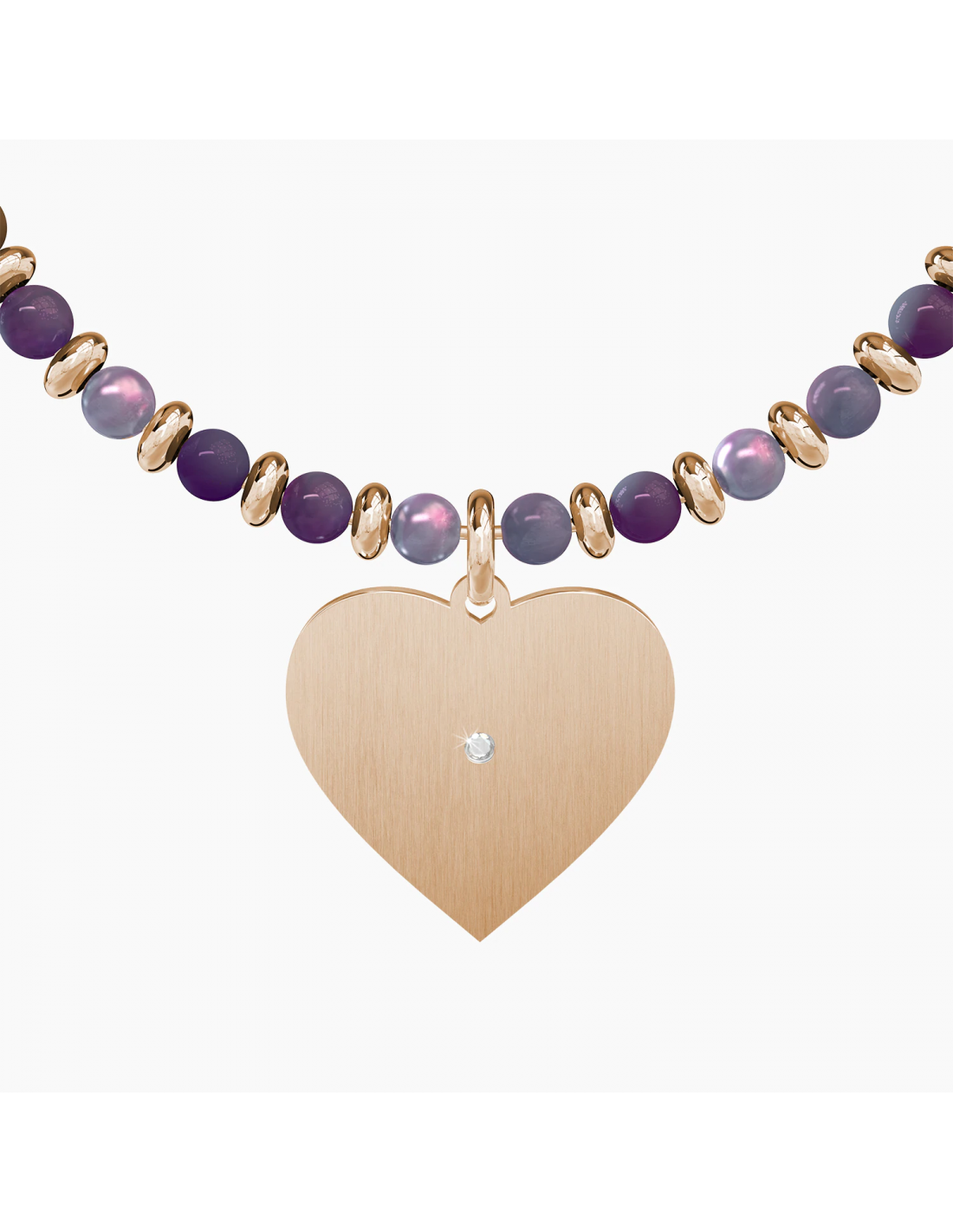 Bangle con filo armonico in acciaio color oro rosa, sfere in ametista e ciondolo satinato a cuore.