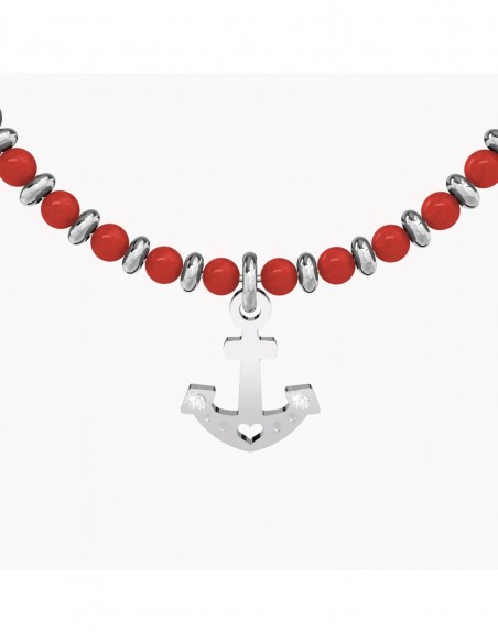 Un'ancora in mezzo al mare, pronta a resistere a qualsiasi tempesta. Nel viaggio verso nuovi orizzonti, tra le onde della vita, sei un punto fermo su cui poter sempre contare. Bangle con filo armonico in acciaio, sfere in corallo rosso e ciondolo ad ancora.