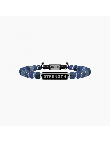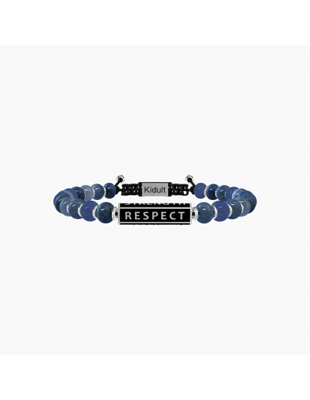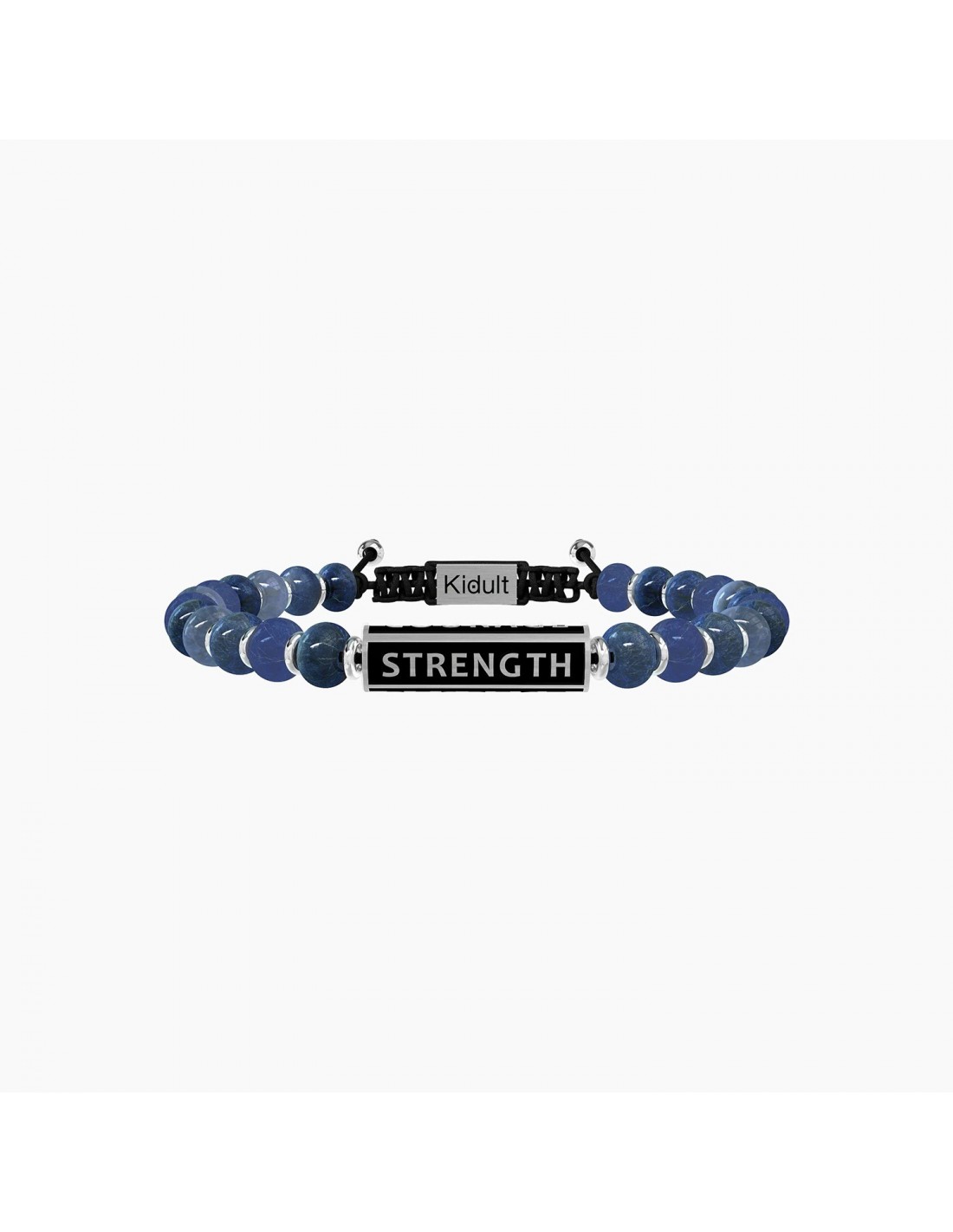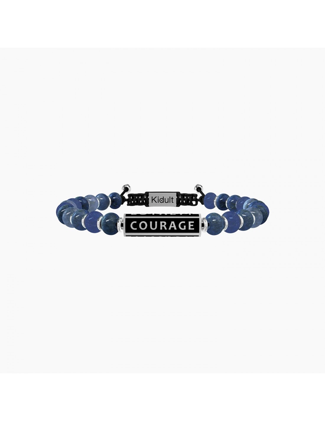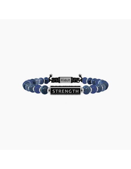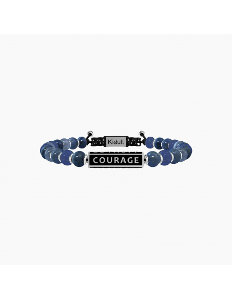 Sii forte come un leone, rispetta il prossimo, rimani fedele ai tuoi valori, osa sempre con coraggio. Bracciale con sfere in dumortierite blu e elemento cilindrico in acciaio di colore nero.