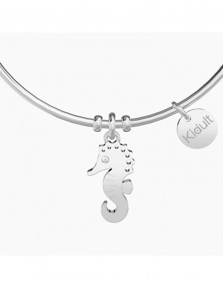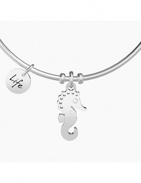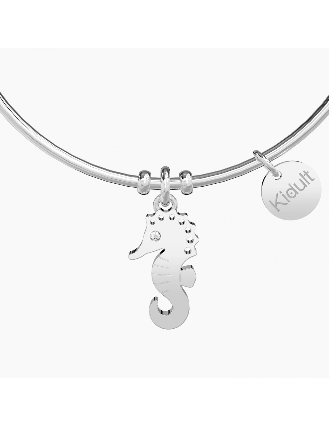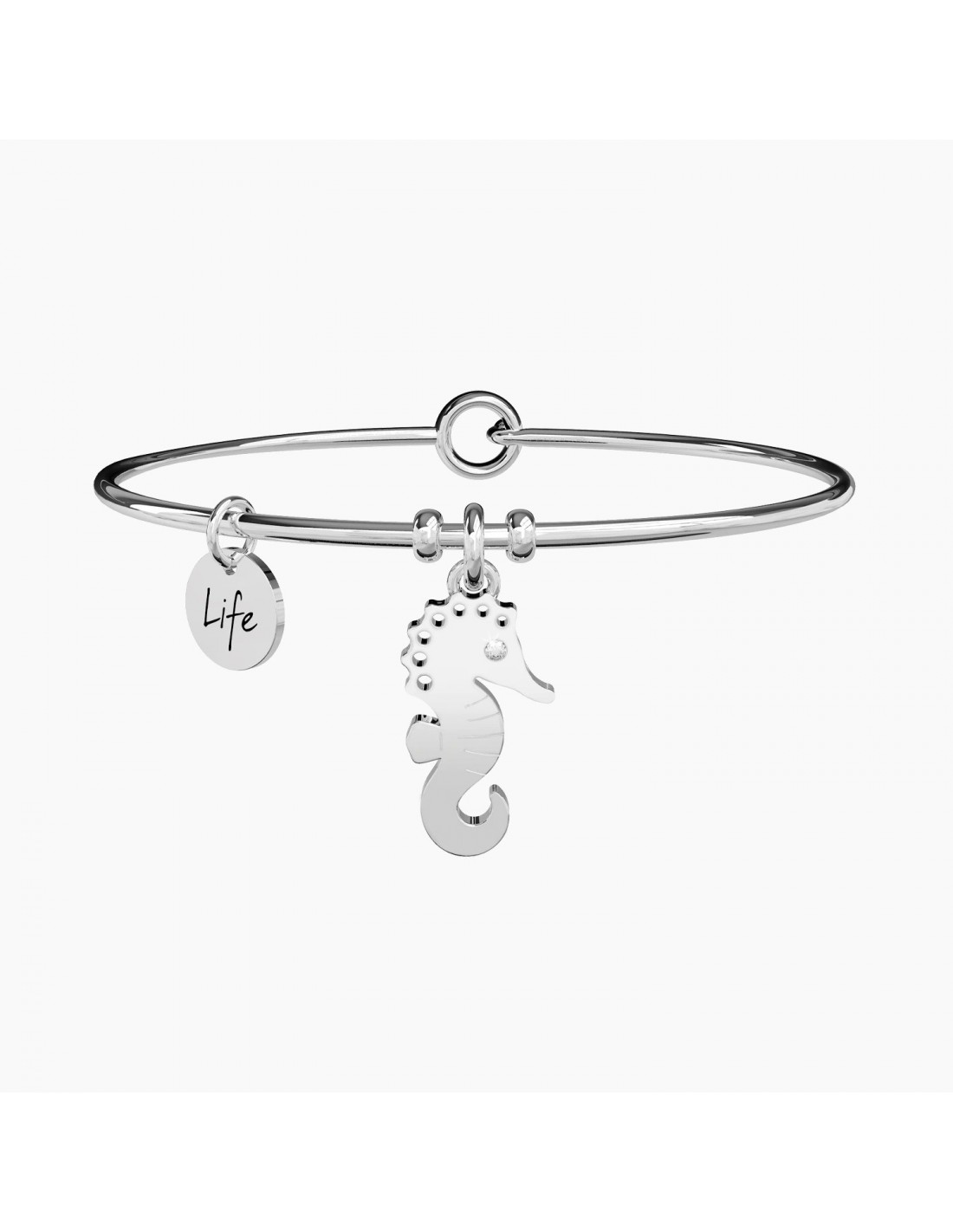 Lasciati trasportare dalle onde per vivere sempre giorno per giorno, minuto per minuto. Cos“ la tua vita sarˆ un tuffo in mare aperto, seguendo mille riflessi d'argento. Bangle in acciaio con ciondolo Cavalluccio.