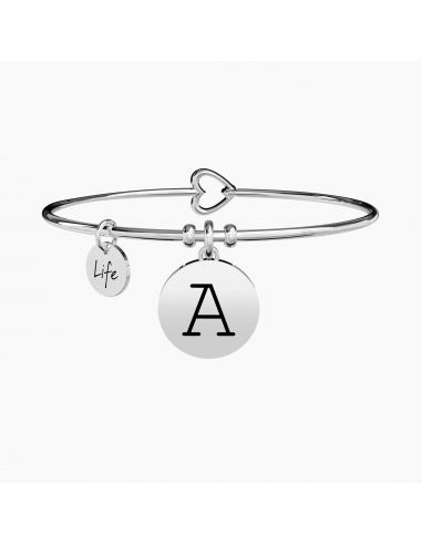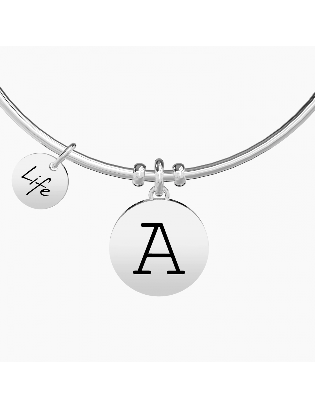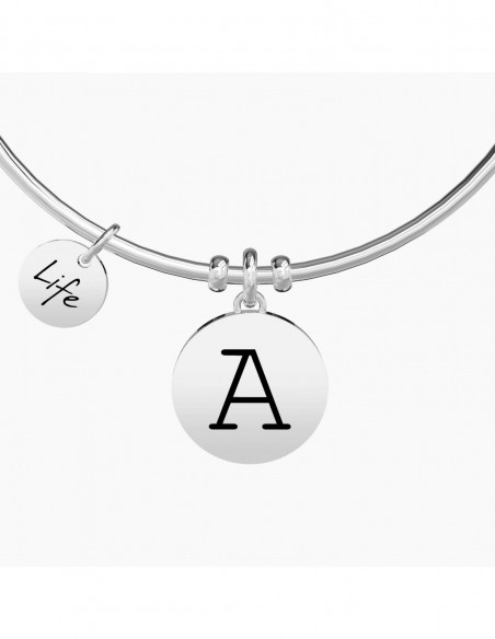 é l'iniziale del tuo nome, di una persona speciale o di qualcuno che ti sta a cuore. La tua lettera preferita, il principio di una parola, una frase, una storia. La vita un alfabeto di emozioni. Bangle in acciaio con ciondolo tondo con lettera A.