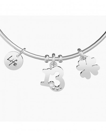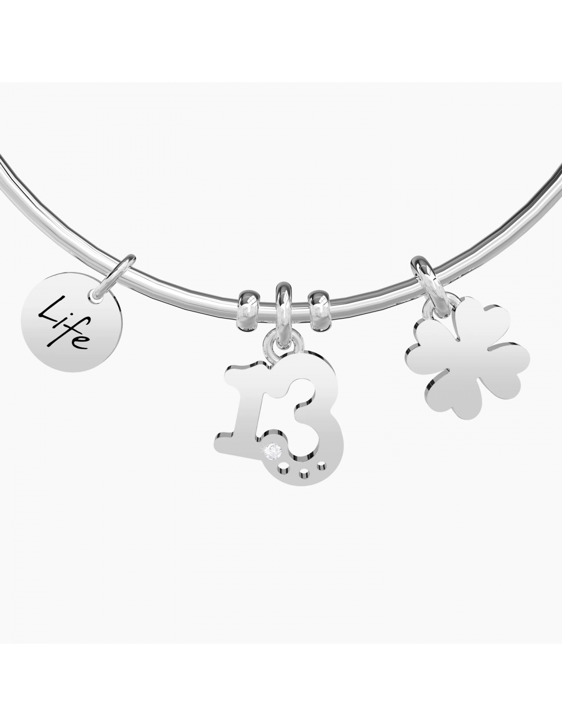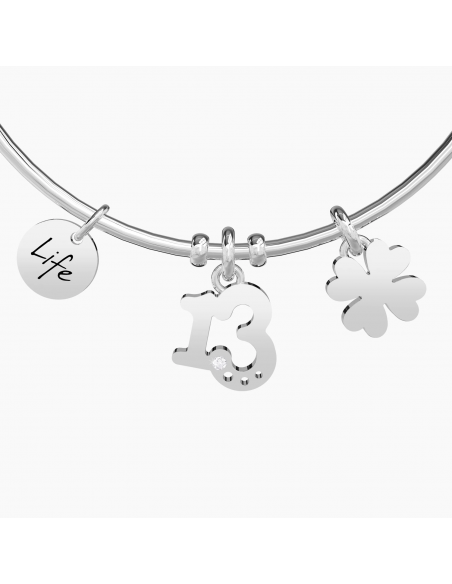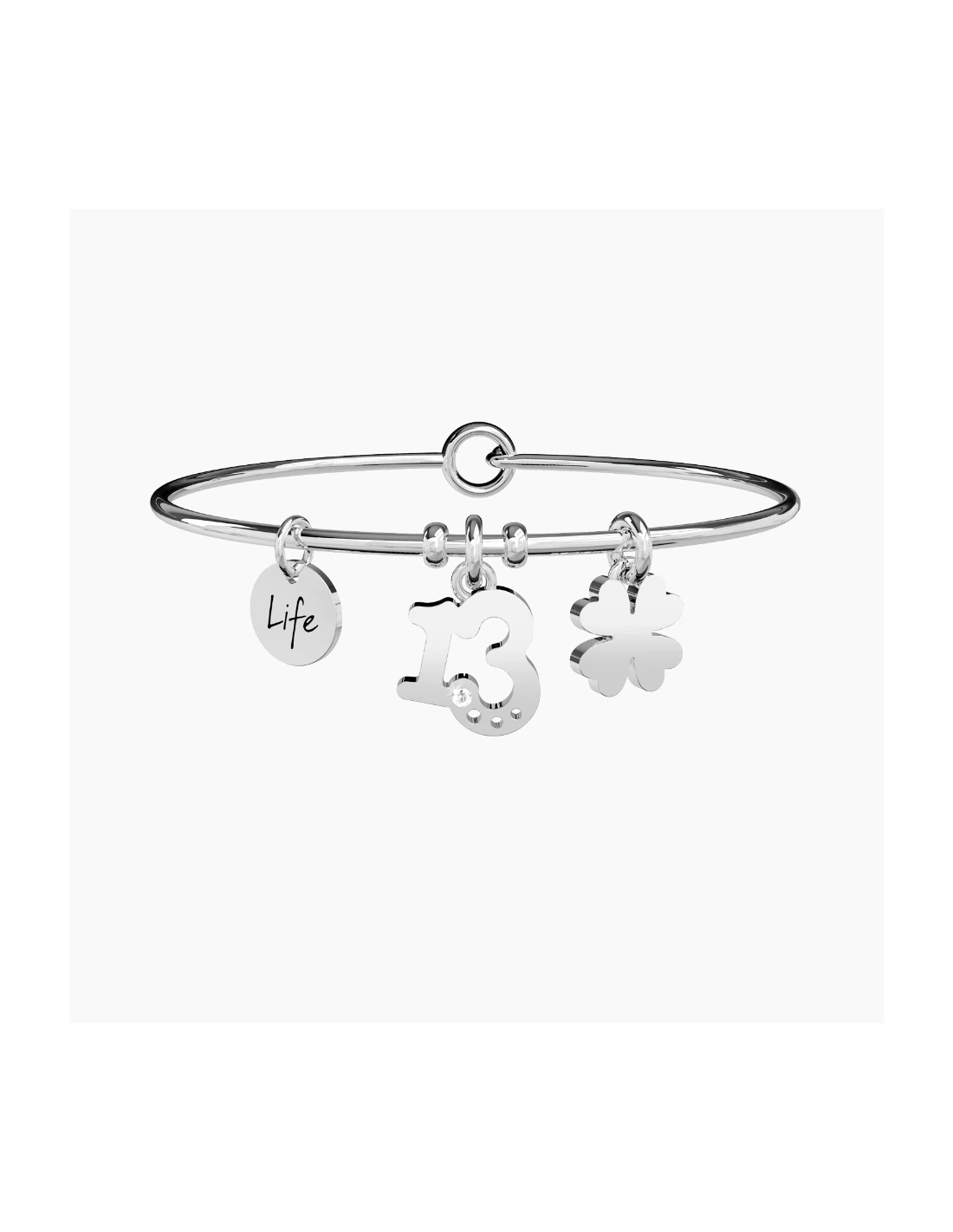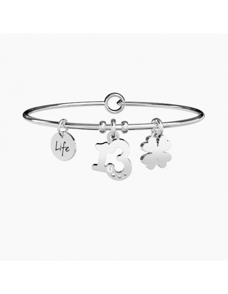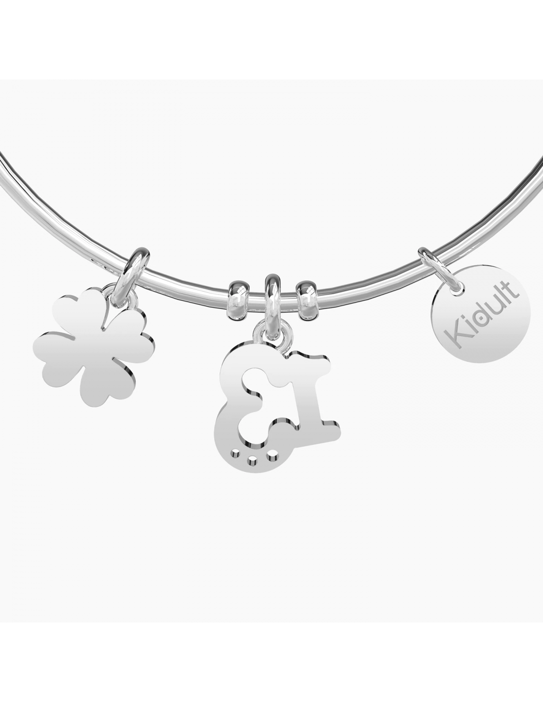 Credi nei numeri e nel destino, tredici  adesso sul tuo cammino. Sarai ogni giorno sempre pi forte, ricchezza, vittorie e buona sorte. Bangle in acciaio con ciondoli a forma di 13 e di quadrifoglio.