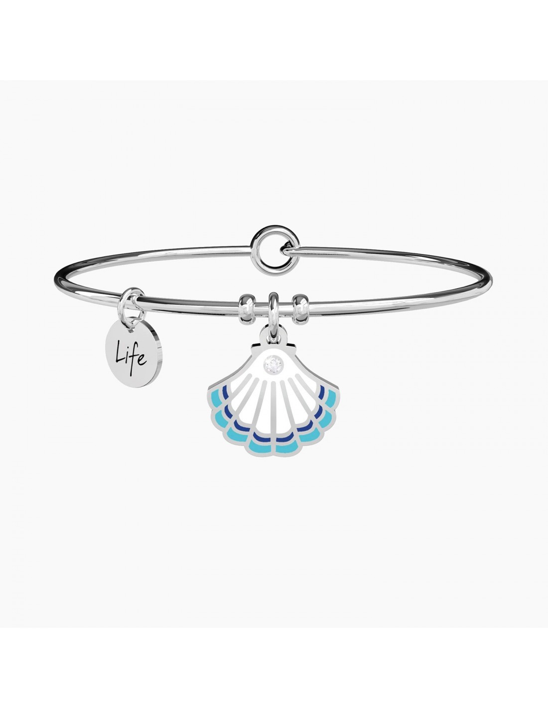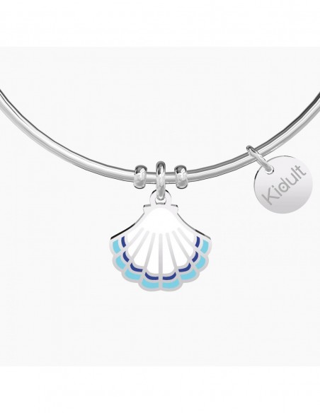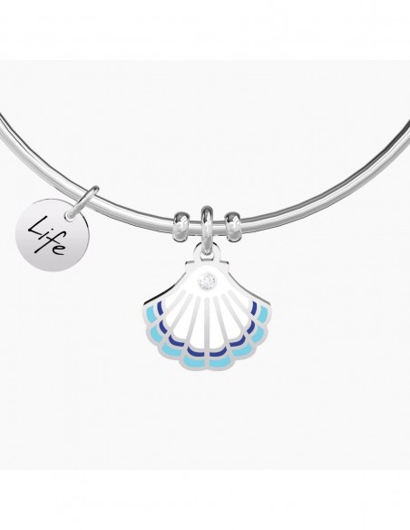 Custodisce ricchezza, racchiude saggezza, uno scrigno di gioia e fortuna che atterra sulla tua riva. Bangle in acciaio con ciondolo a conchiglia smaltato.