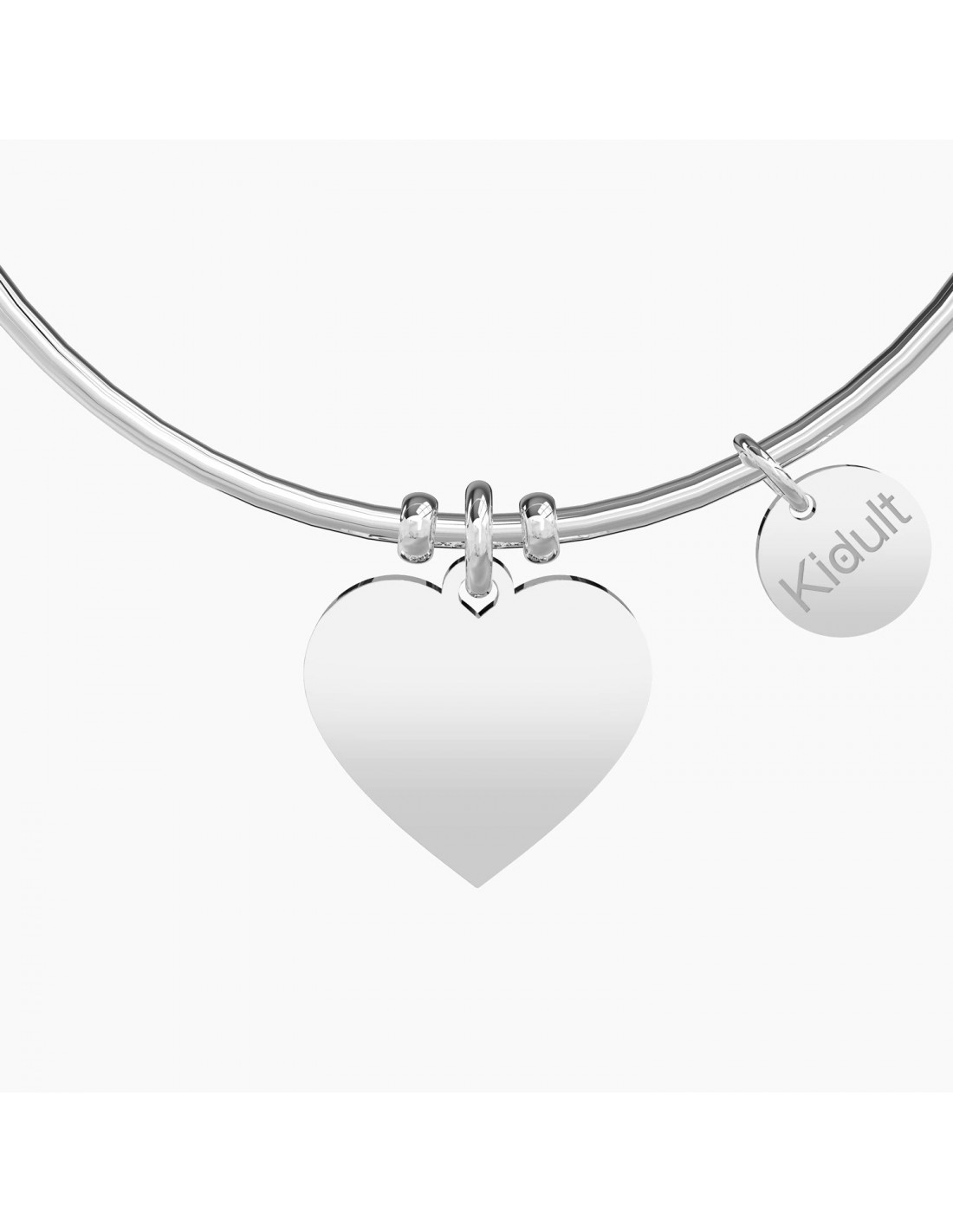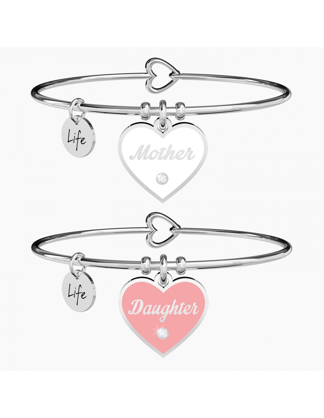 Siamo due metˆ dello stesso cuore, unite per sempre da un amore infinito. Set di due bangle in acciaio con ciondoli a cuore smaltati bianco e rosa.