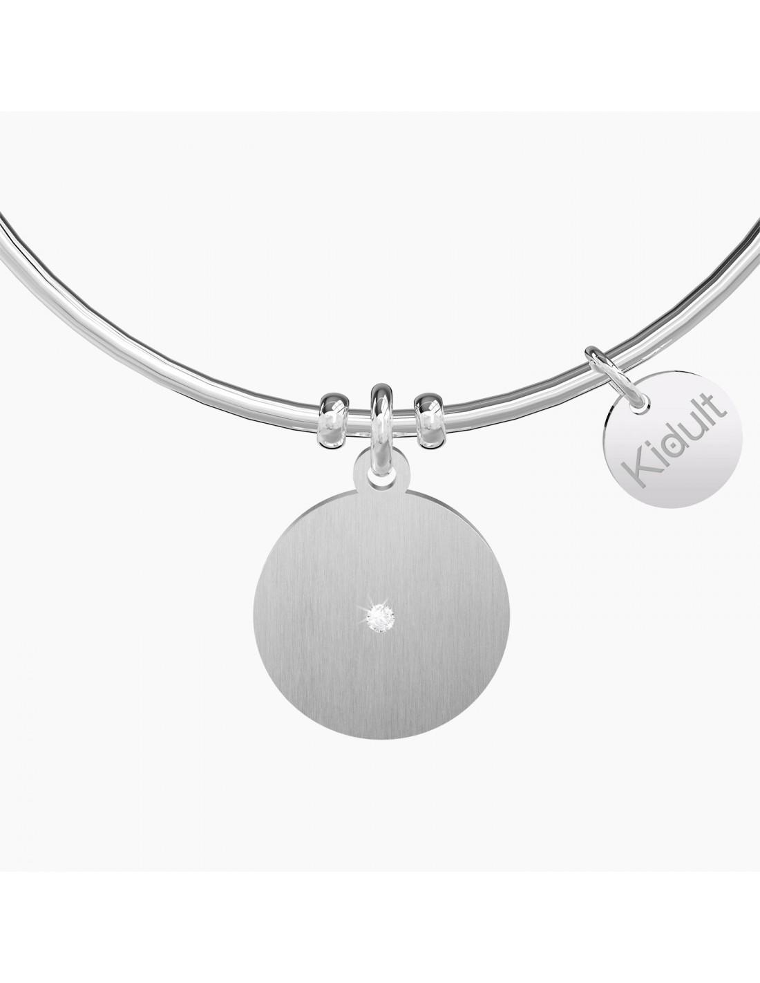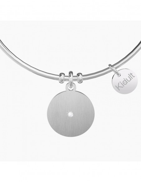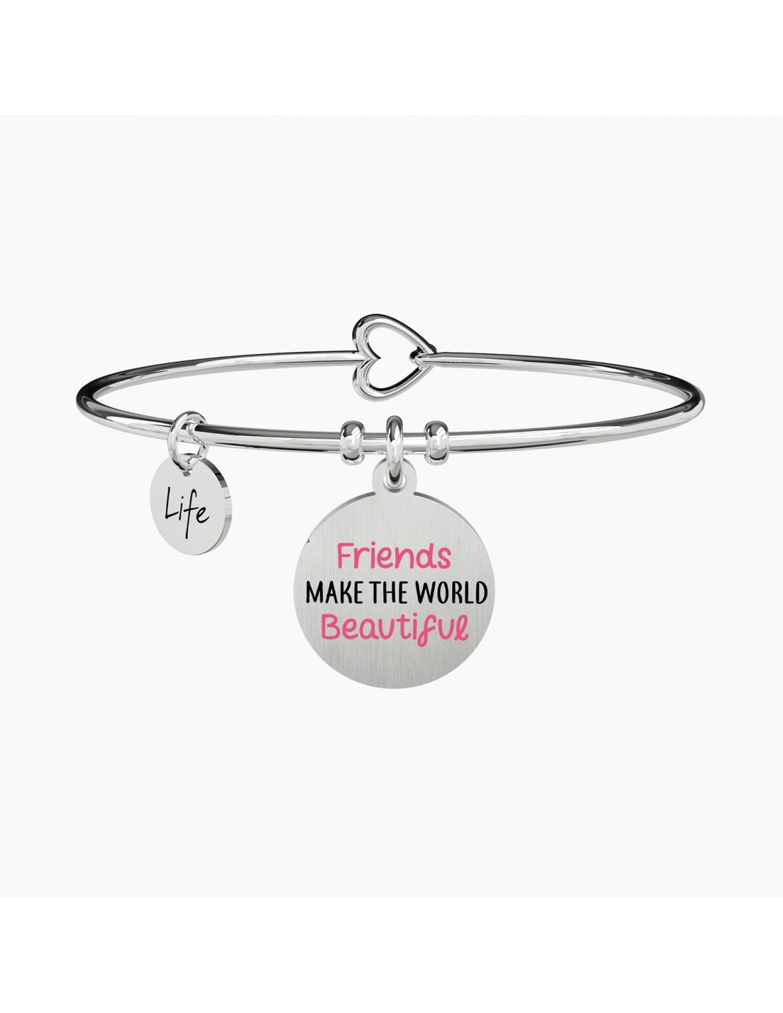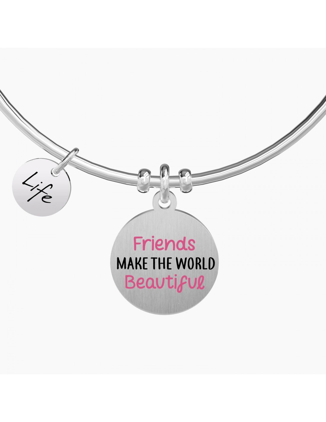 Friends make the world beautiful Bangle in acciaio con ciondolo satinato tondo con scritta smaltata rosa e nera.