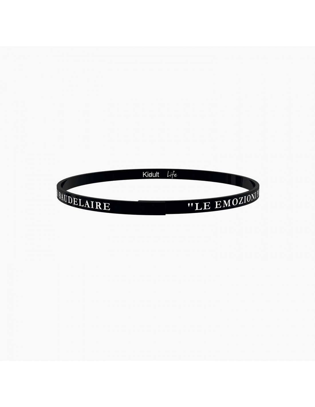 "Le emozioni pi belle sono quelle che non sai spiegare." - Charles Baudelaire - Bangle sottile in acciaio satinato color nero con scritta bianca.