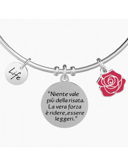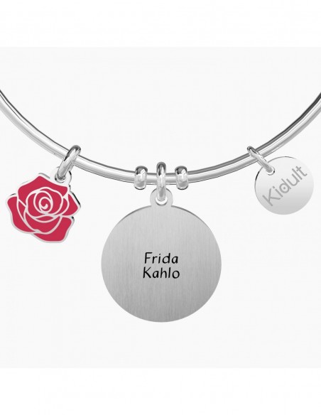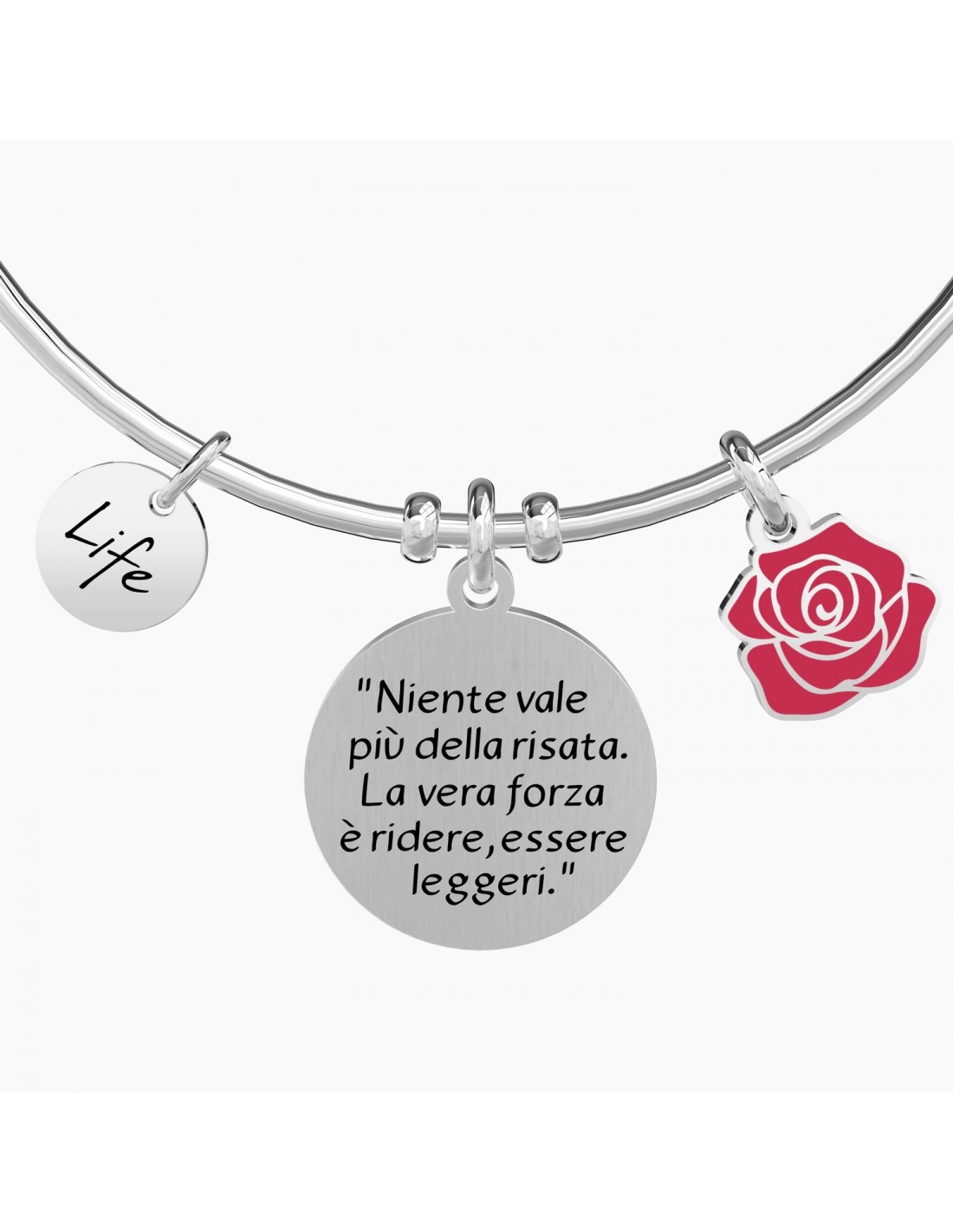 Bangle in acciaio con ciondoli satinato tondo e a rosa smaltata rossa.