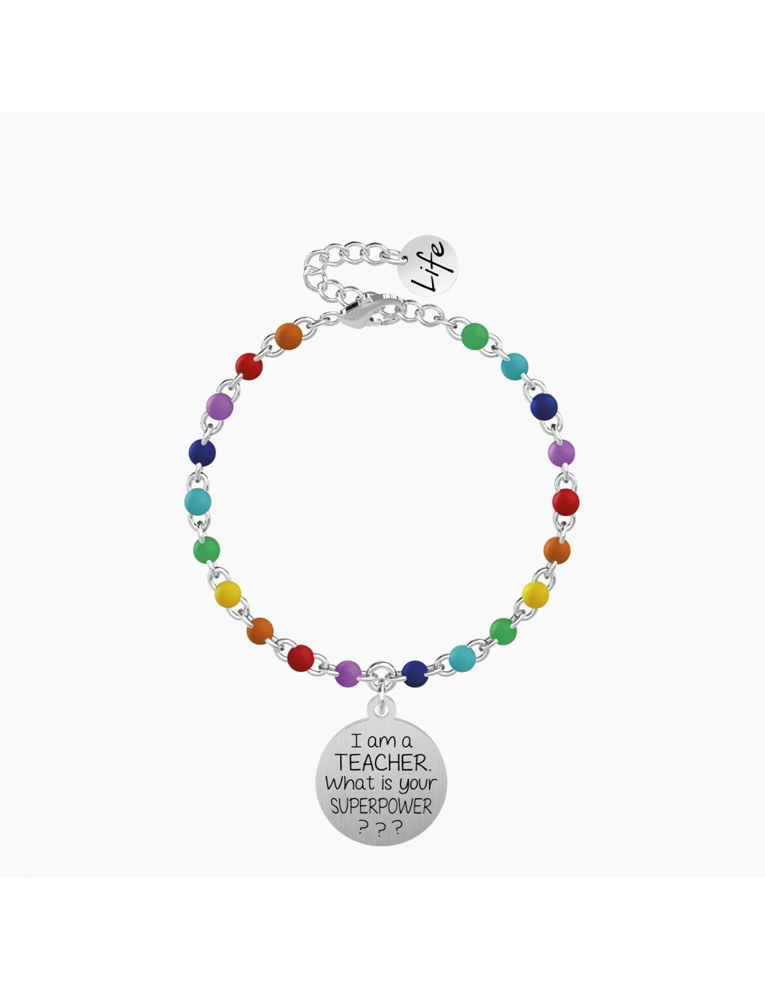 Bracciale in acciaio con ciondolo satinato tondo e catena rol con inserimenti in smalto multicolor.