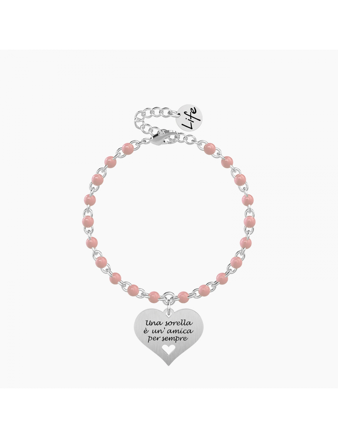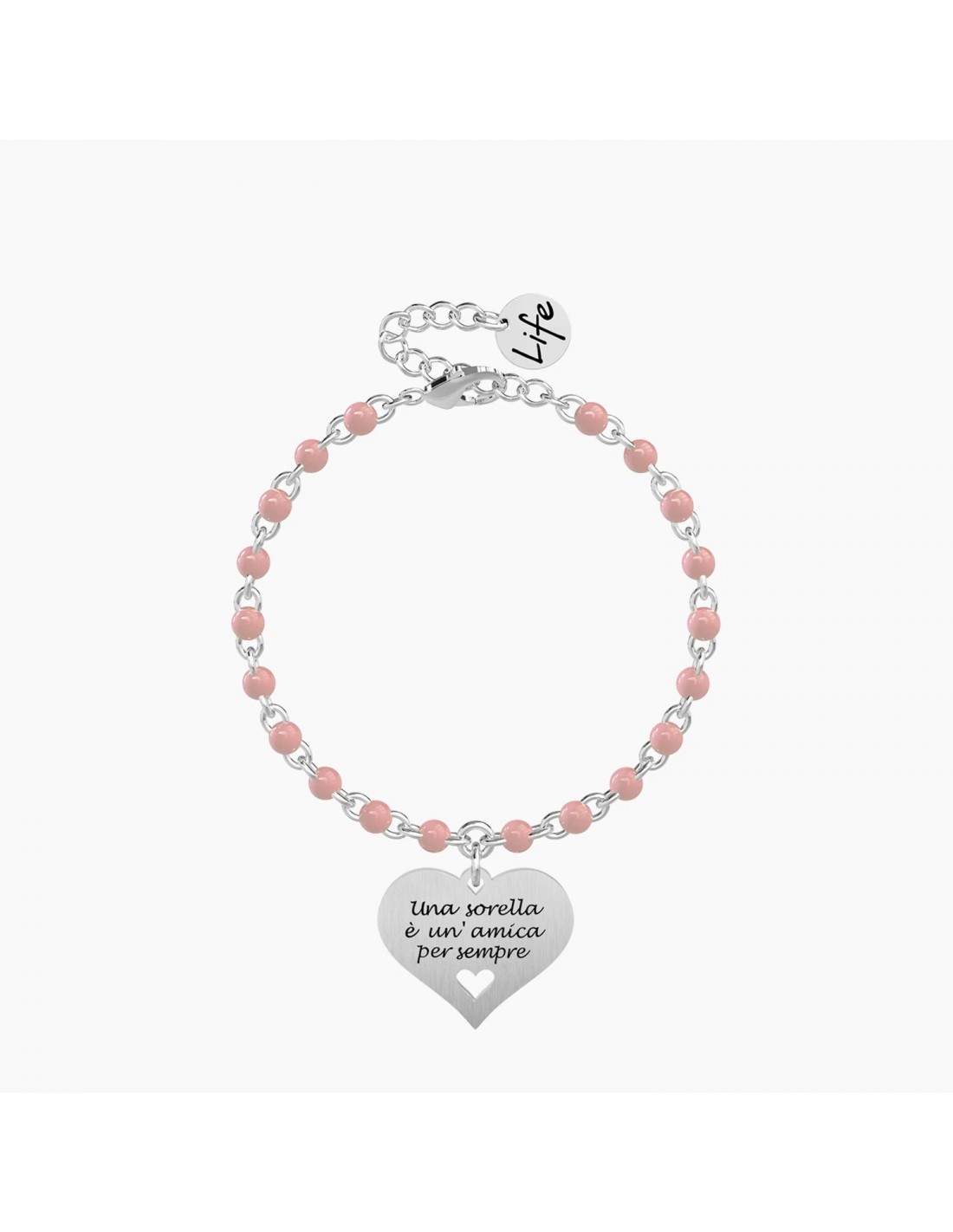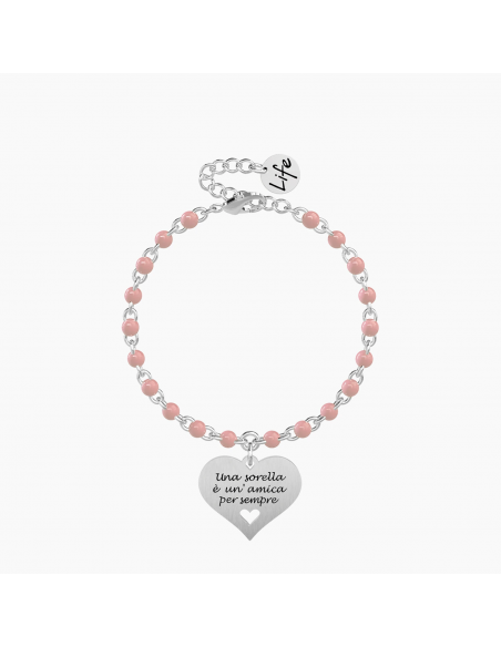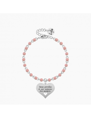 Bracciale in acciaio con ciondolo satinato a cuore e catena rol con inserimenti in smalto rosa.