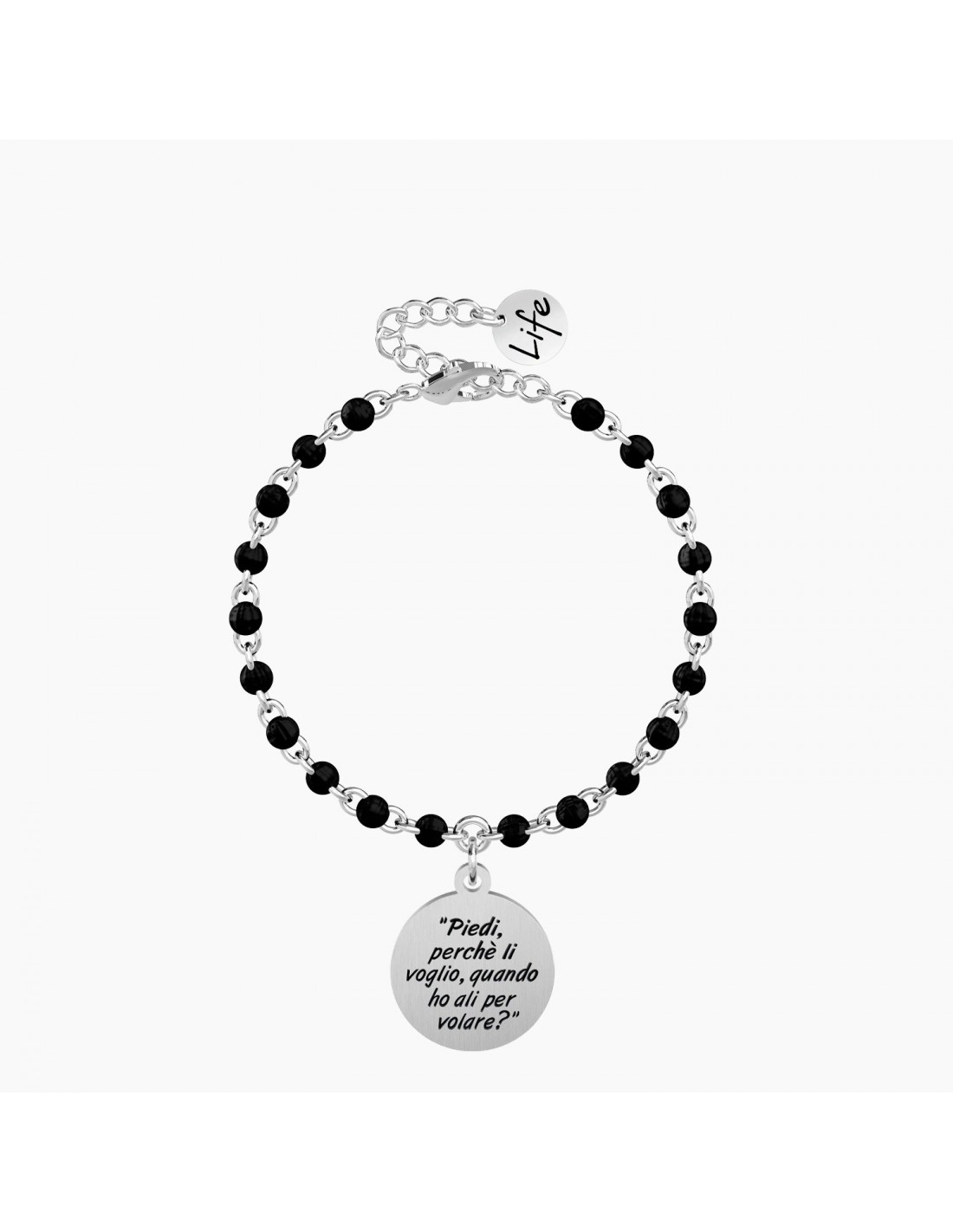 Bracciale in acciaio con ciondolo satinato tondo e catena rol con inserimenti in smalto nero.