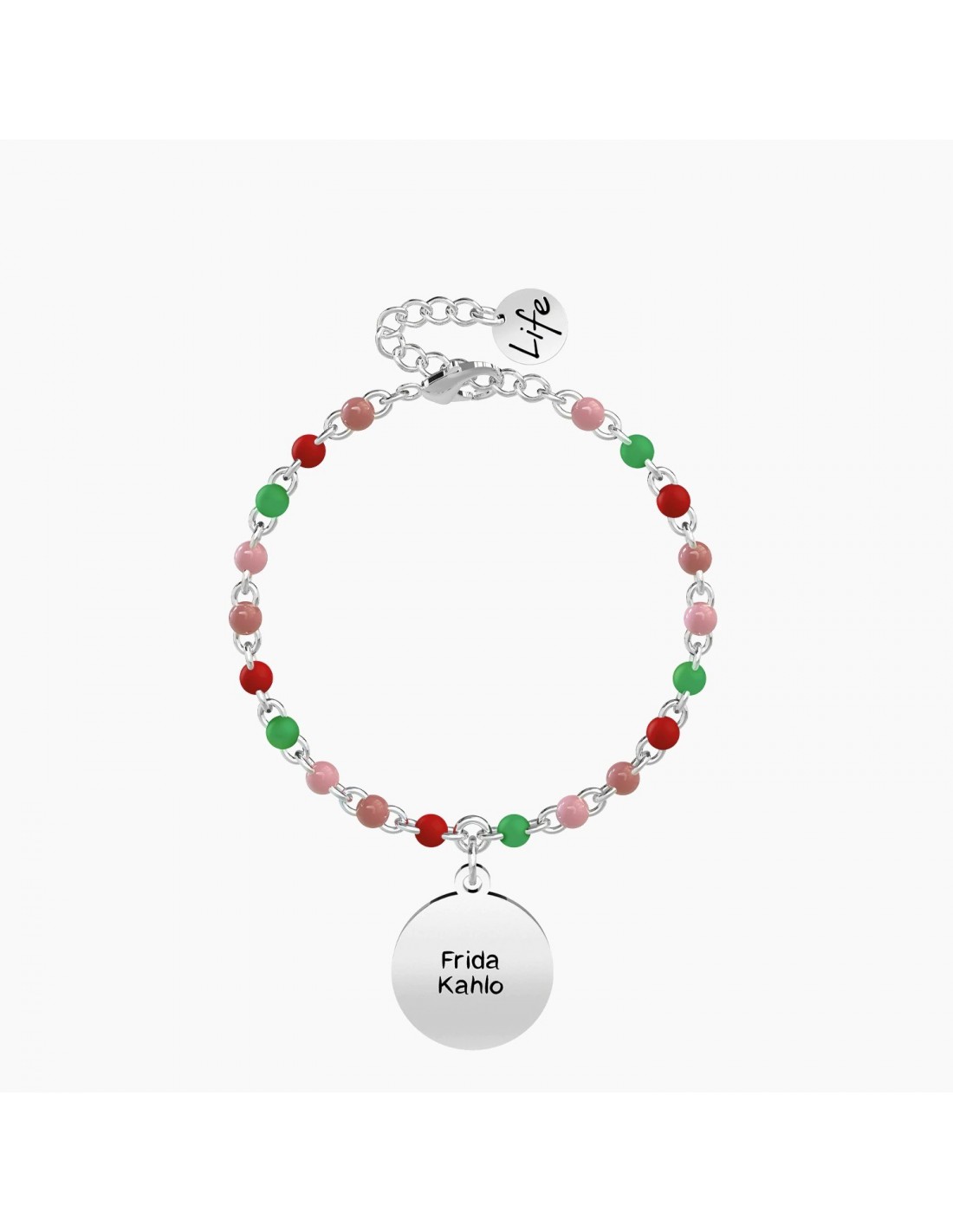 Frida Kahlo Official Collection La bellezza di essere donna, la magia di essere unica, la forza di essere diversa. Bracciale in acciaio con ciondolo tondo smaltato rosa e catena rol˜ con inserimenti in smalto multicolor.