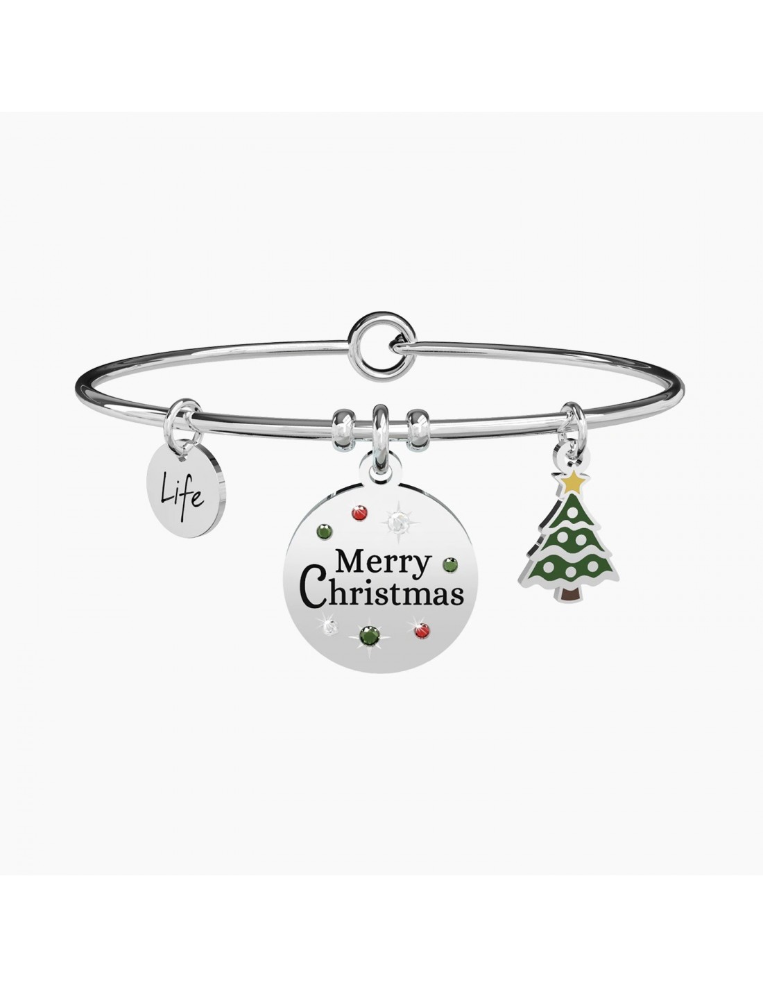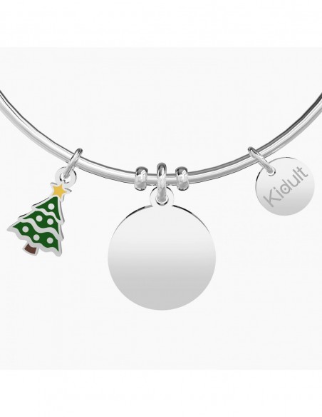 La mia famiglia riunita, un albero acceso, il calore di un abbraccio. Da sempre, il miglior regalo di Natale. Bangle in acciaio con ciondolo tondo con cristalli colorati e ciondolo a forma di albero di Natale con smalti colorati.