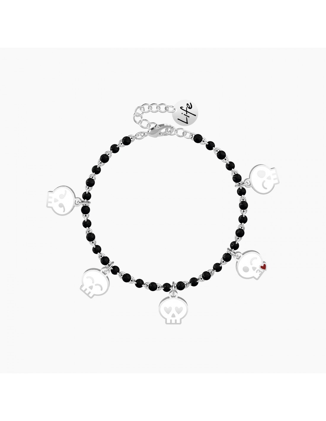 Bracciale in acciaio con ciondoli smaltati a forma di teschietti e catena rol con inserimenti in smalto nero.
