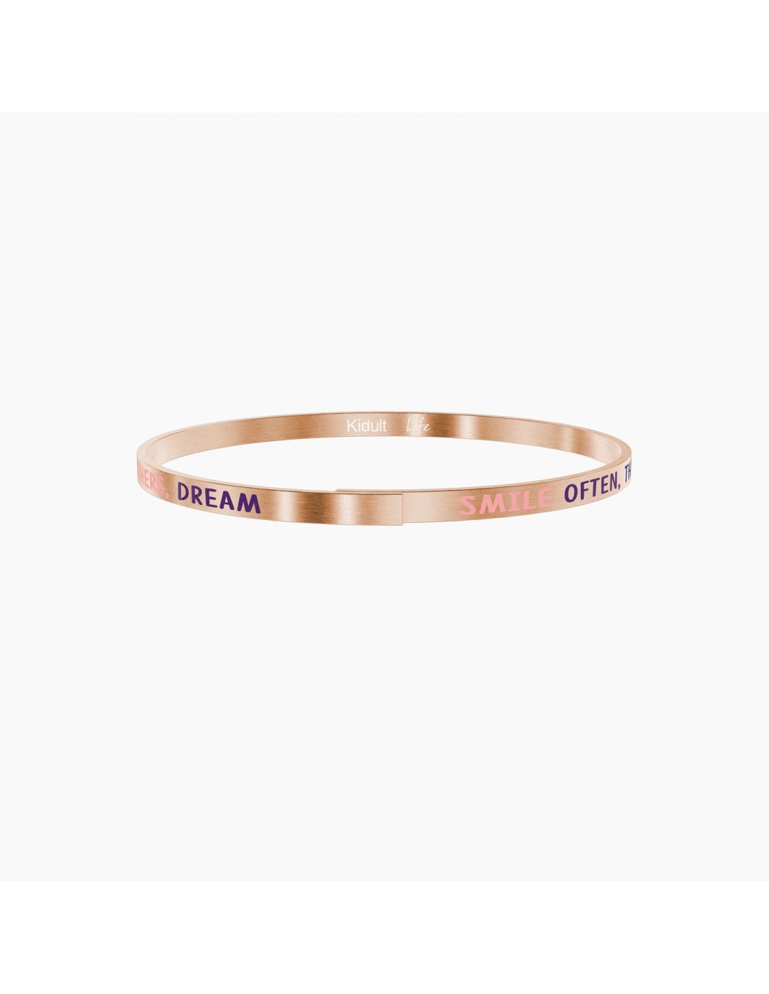 Smile often, think positively, give thanks, laugh loudly, love others, dream Bangle sottile in acciaio satinato color oro rosa con scritta smaltata grigia e rosa.