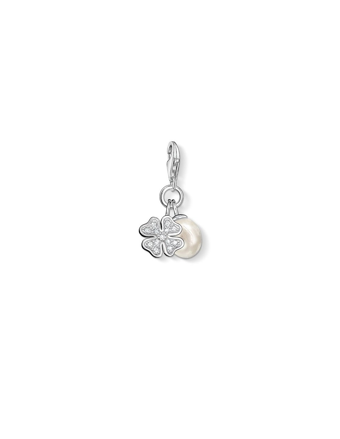 Categoria Ciondolo Charm. Materiale argento sterling 925. Pietre pavé di zirconi sintetici, bianco, perla di acqua dolce coltivata. Colore argentato, bianco. Chiusura a moschettone. Altezza appross. 2,70 cm (1,06 pollici). Larghezza appross. 1,30 cm (0,51 pollici).Codice articolo 0831-167-14.