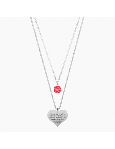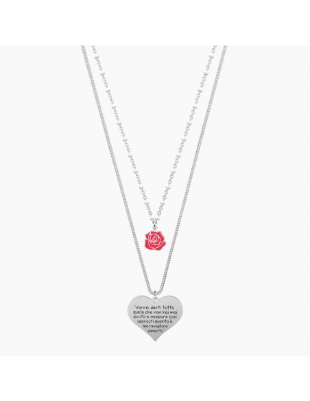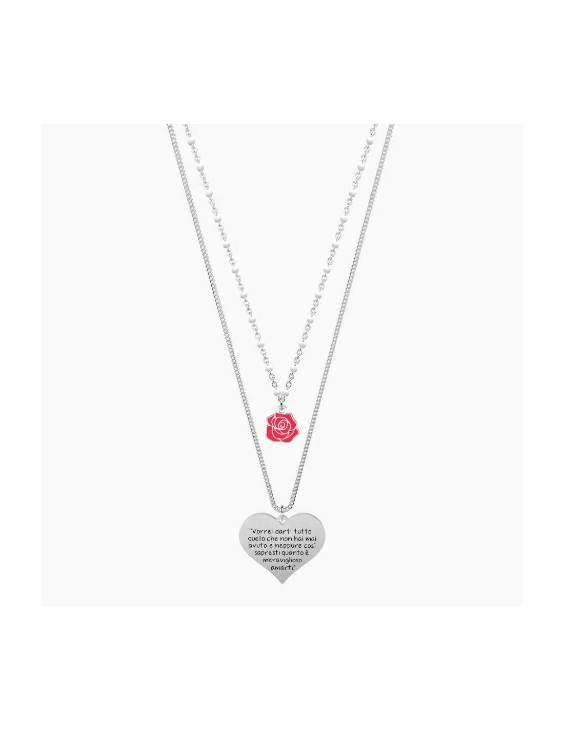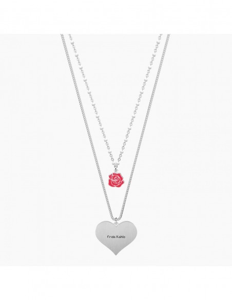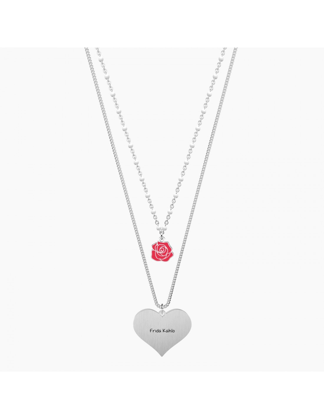 Frida Kahlo Official Collection "Vorrei darti tutto quello che non hai mai avuto e neppure cos“ sapresti quanto  meraviglioso amarti." - Frida Kahlo - Collana lunga in acciaio con ciondoli satinato a cuore e a rosa smaltata rossa, a due catene groumette e rol˜ con inserimenti in smalto bianco.