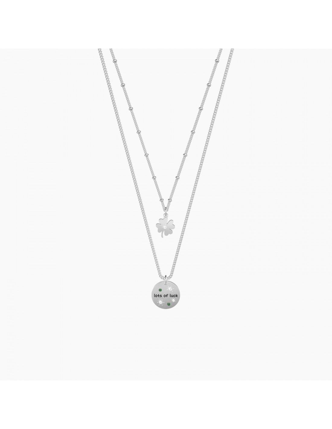 Collana corta in acciaio con ciondoli a forma di quadrifoglio e satinato tondo con cristalli colorati, a due catene groumette semplice e groumette con anellini.