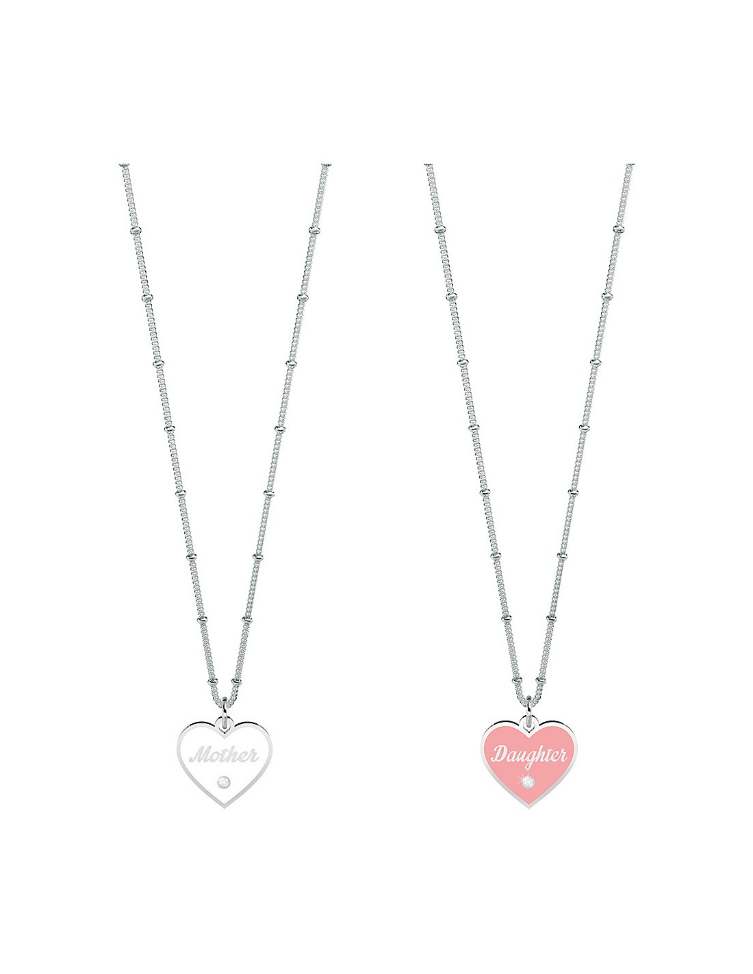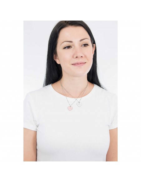 Siamo due metˆ dello stesso cuore, unite per sempre da un amore infinito. Set di due collane corte in acciaio con ciondoli a cuore smaltati bianco e rosa e catena groumette con anellini.